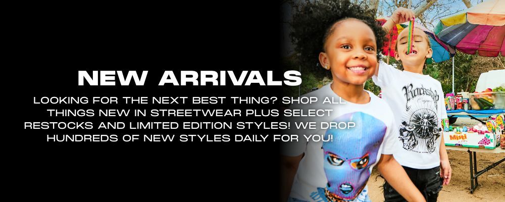These are our latest arrivals for your rock star kids. We don't just have styles for adults — your little ones are going to love the graphic tees, hoodies, track sets, hats, and more of your favorite styles now in kids' sizes. Update your looks for the whole fam'!