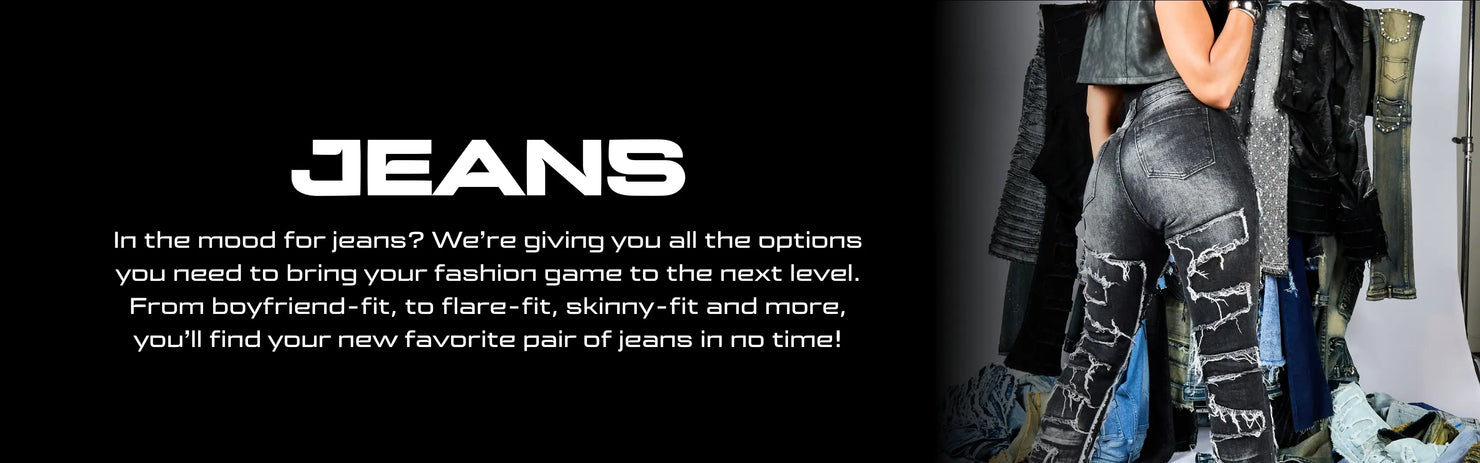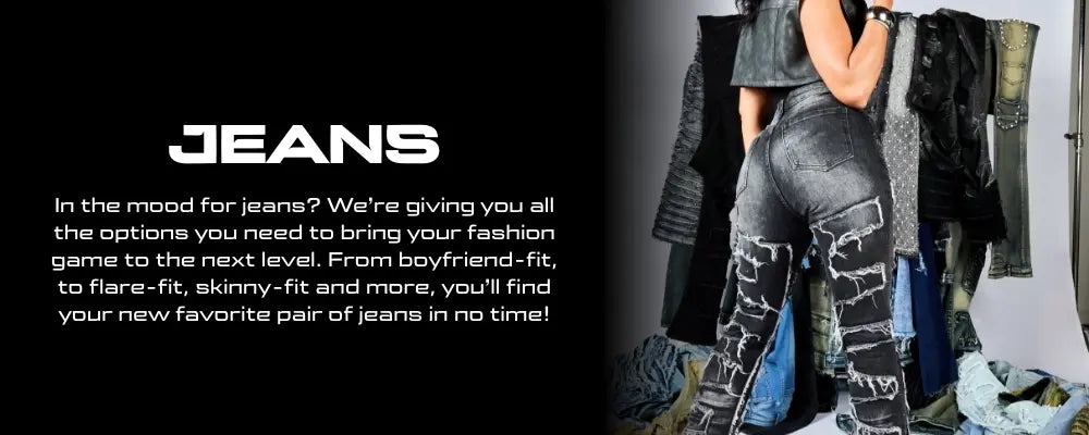 All RSO jeans for women include our signature graphics and designer touches, including quality stitching. RSO has all the best streetwear jean cuts for women: baggy streetwear jeans, skinny fitted jeans, flare bottom, wide leg, high waist, moto biker and boyfriend cuts. Our urban jeans for women are designed to highlight your best features without sacrificing comfort (or your bank account).