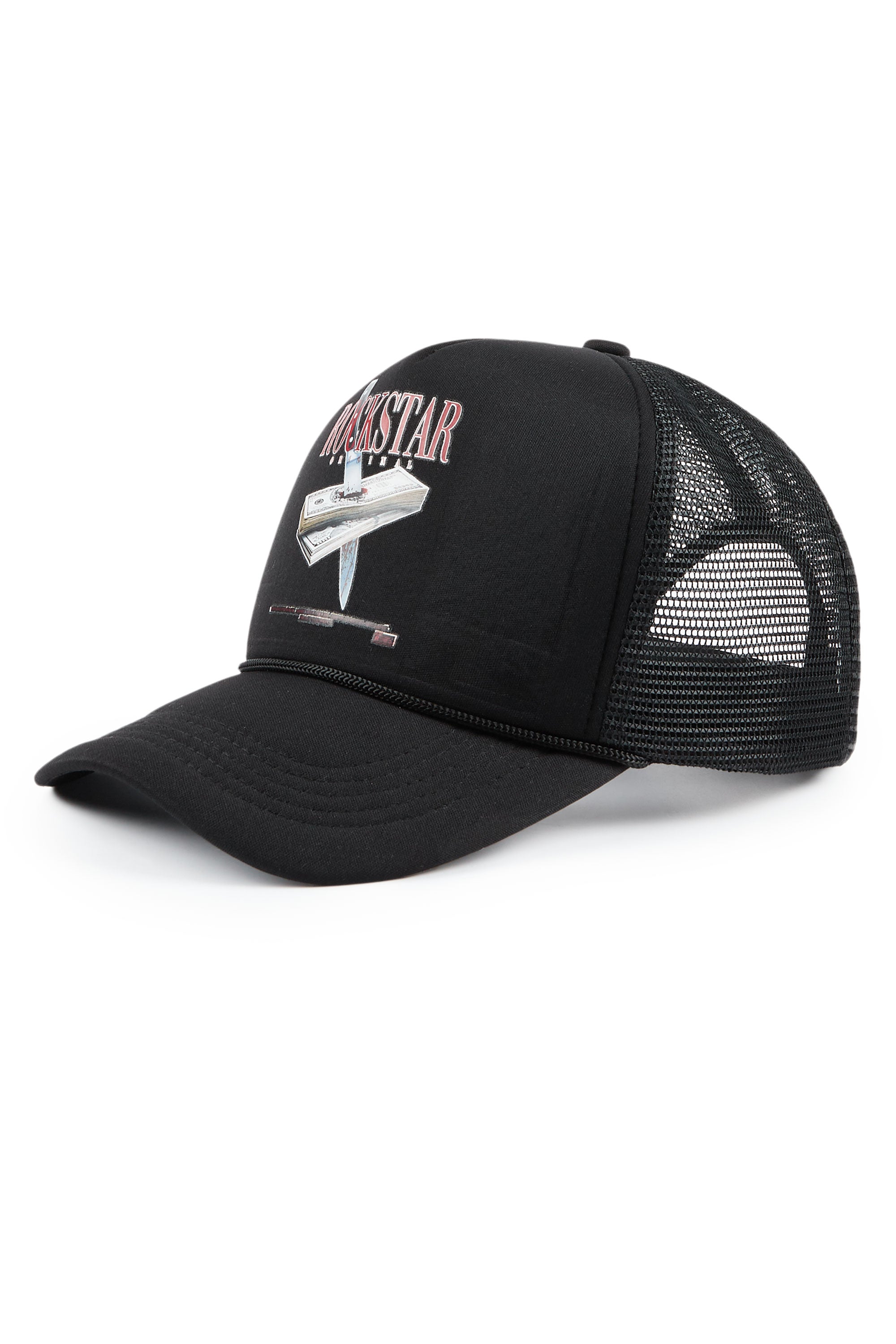 A light-structured trucker hat for men in black. Designed with mesh backing and a traditional ball-cap fit for a versatile accessory.