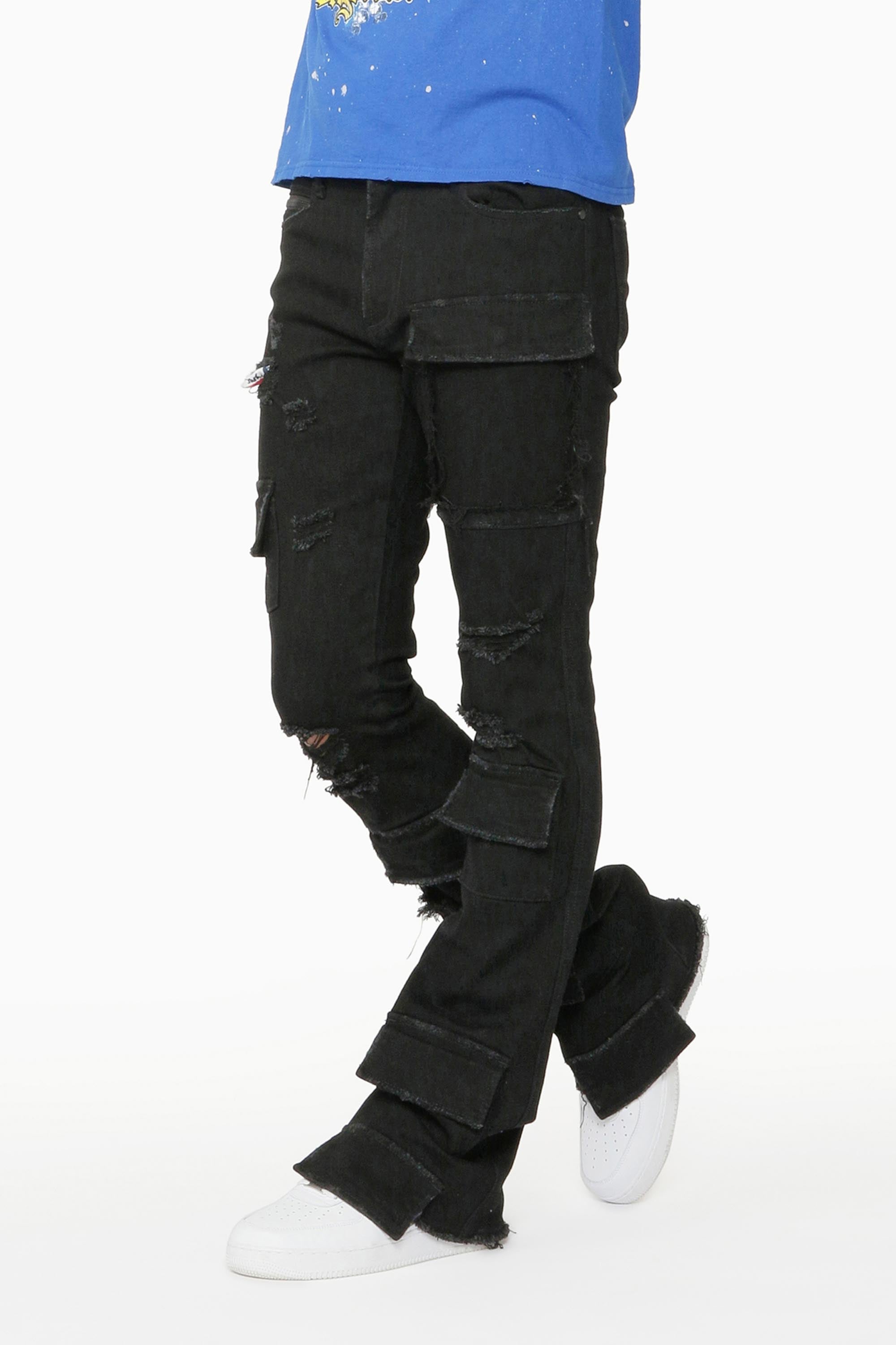 An urban stacked cargo jean for men in black. Designed with organic cotton and extra long legs for a must-cop streetwear staple piece.