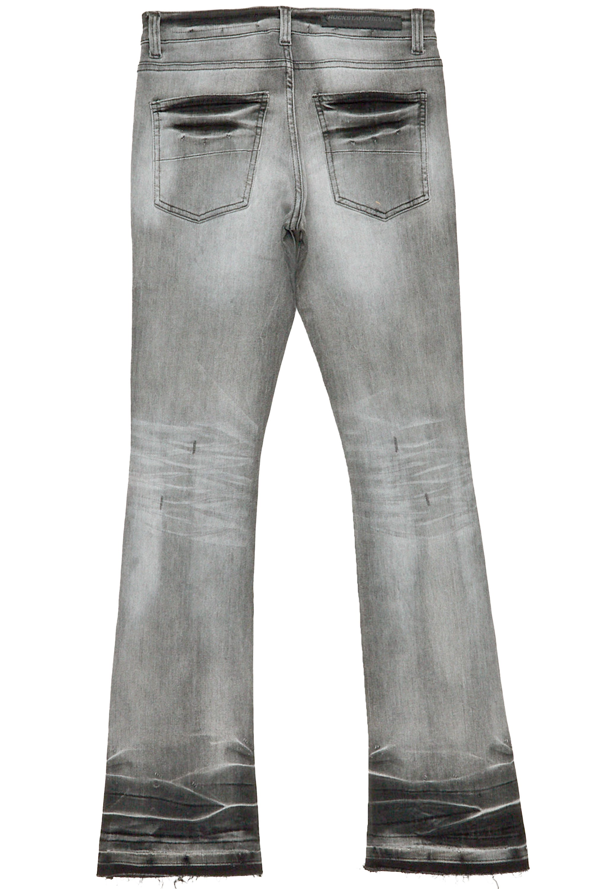 An urban stacked flare jean for men in grey. Designed with organic cotton and washed detailing for a dope streetwear style.