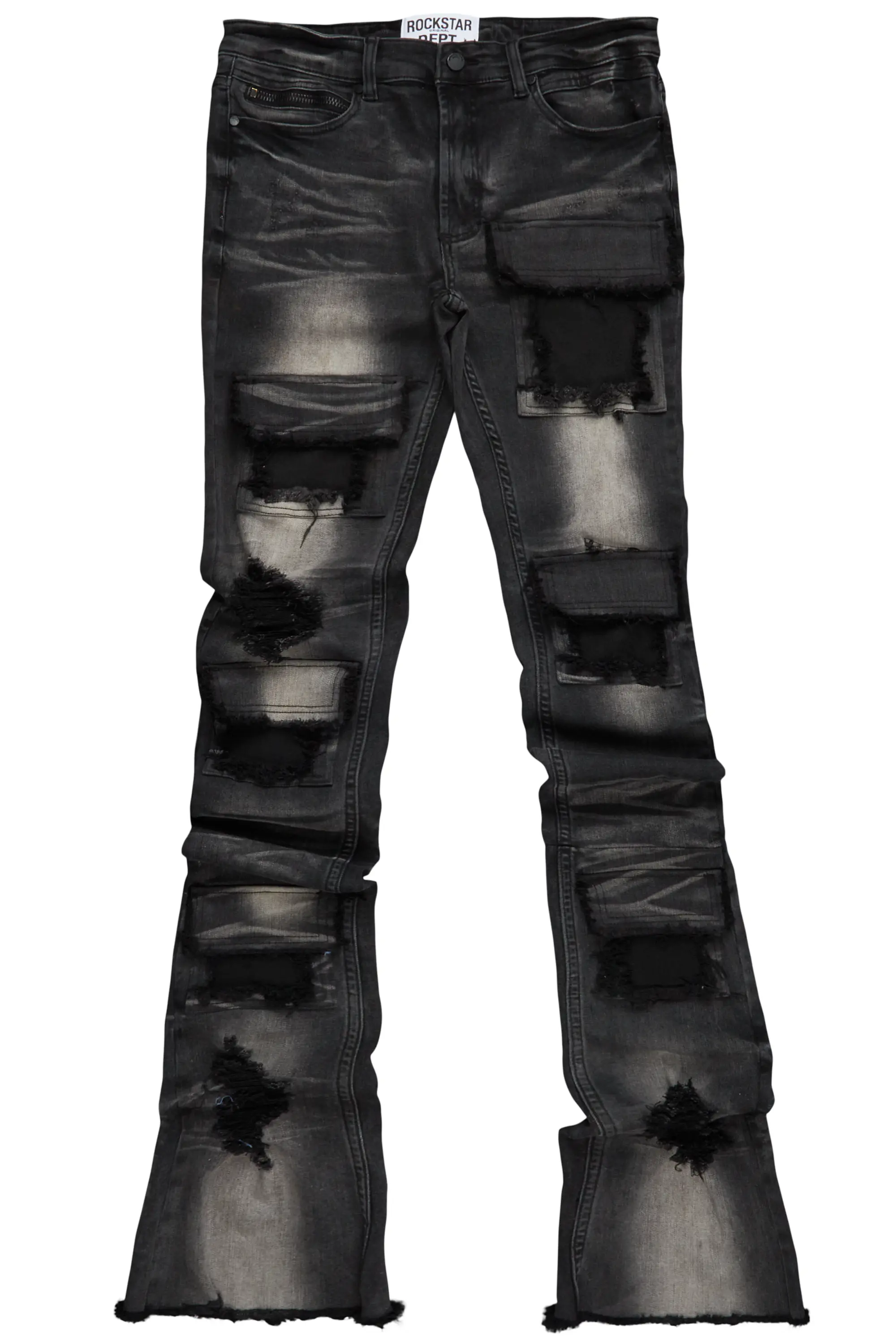 A distressed urban super stack denim jean for men in black. Designed with organic cotton and extra long legs for a dope streetwear style.