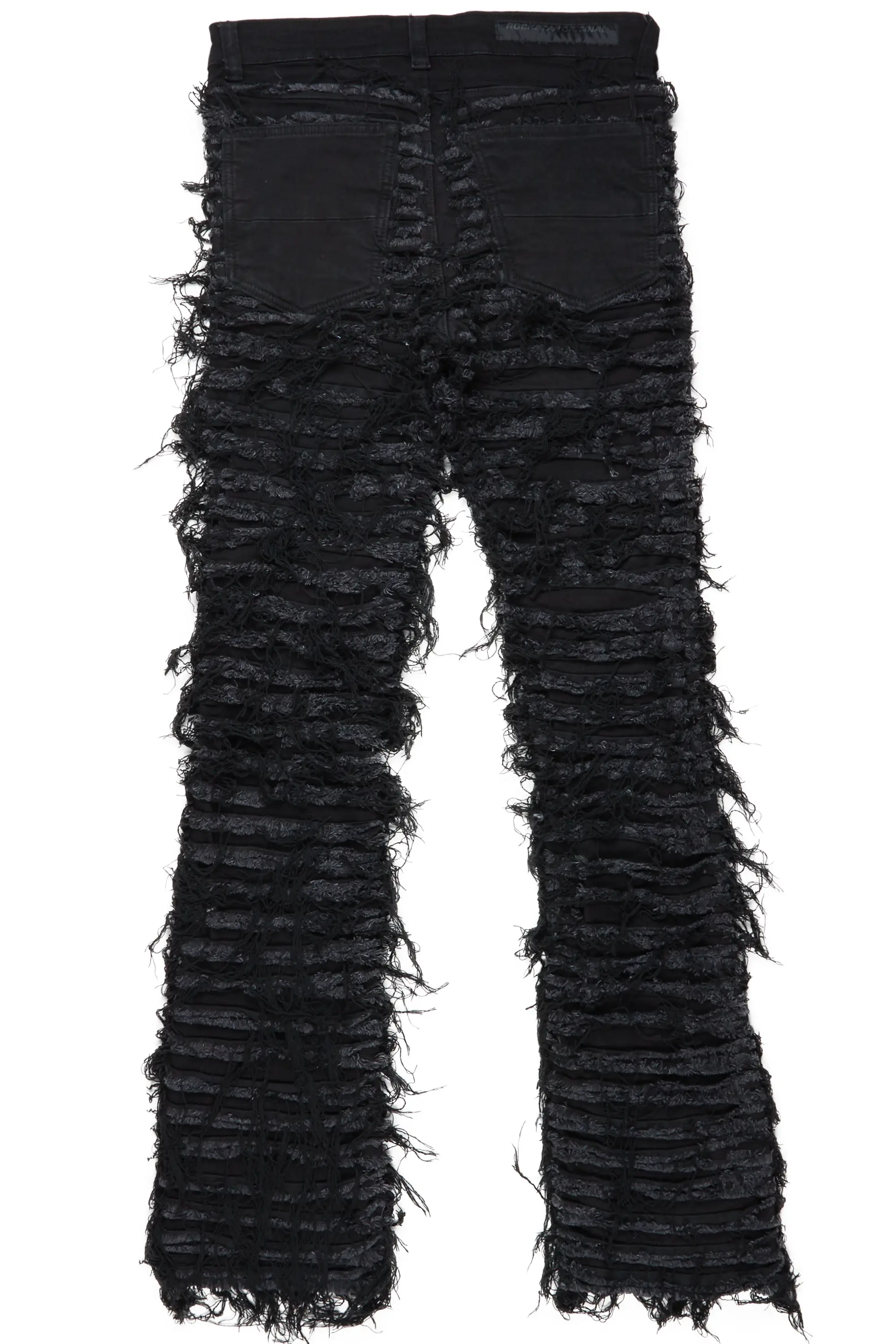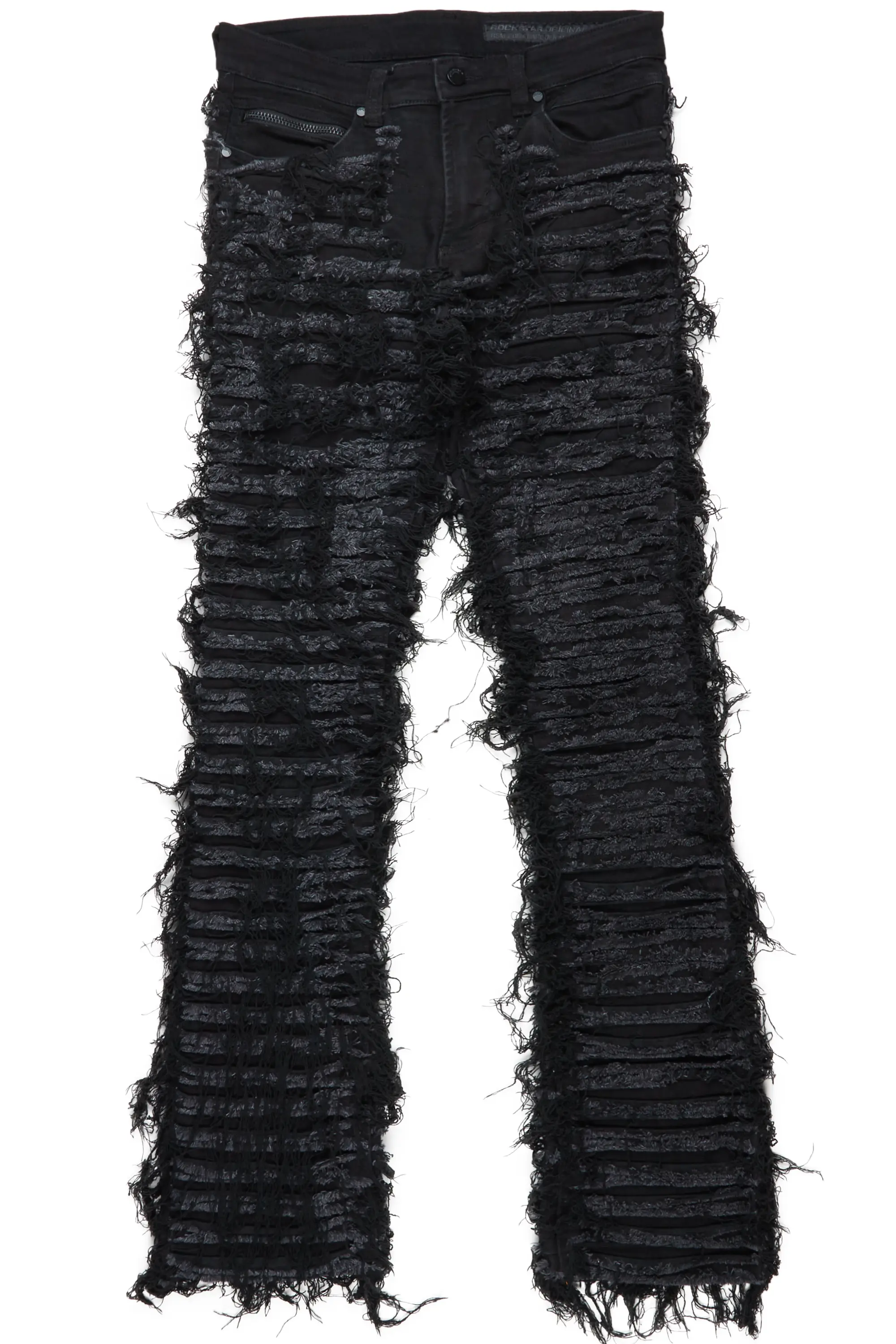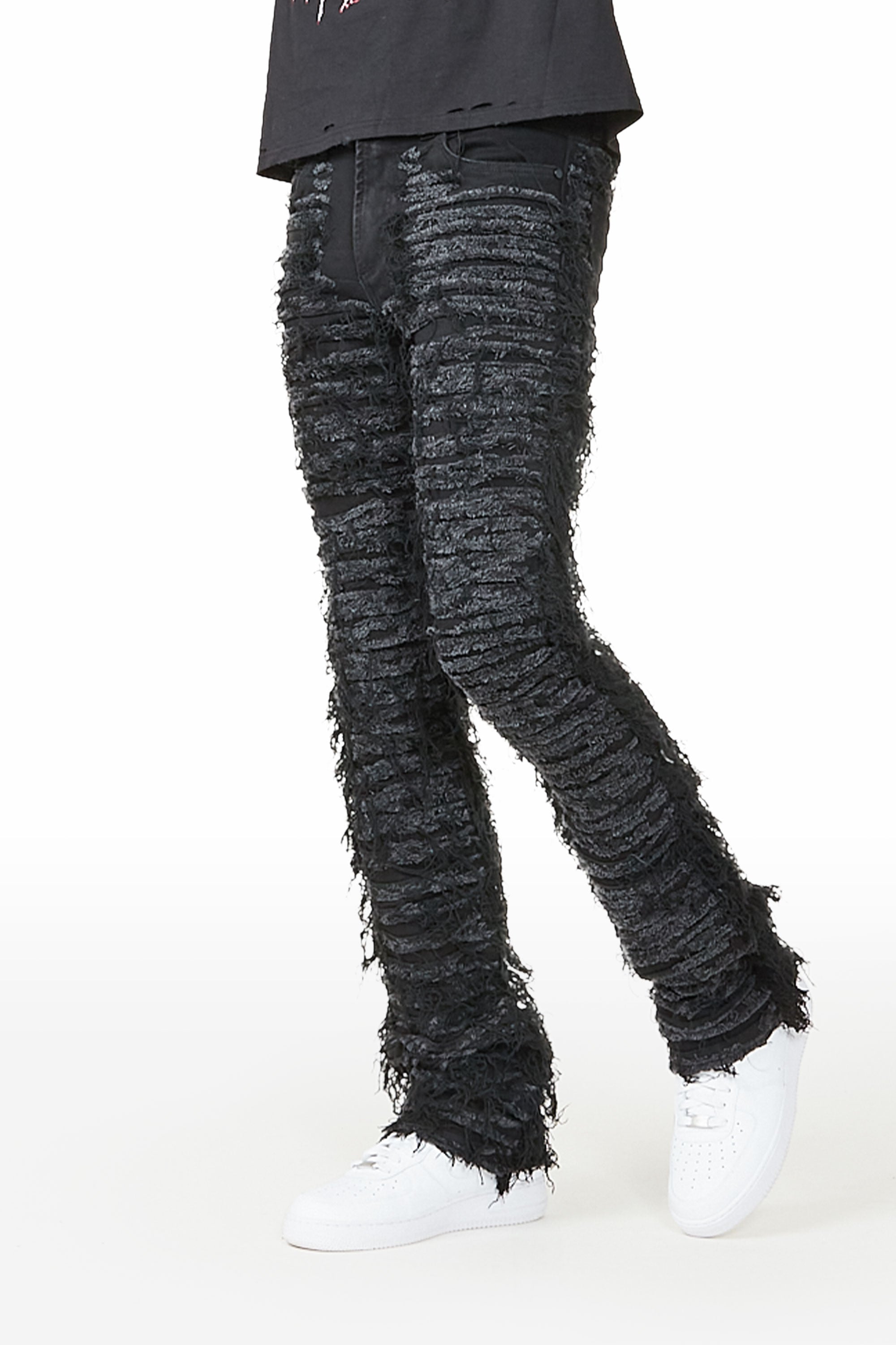 A contemporary shredded stacked denim jean for men in jet black. Designed with organic cotton and frayed designing for a dope streetwear style.