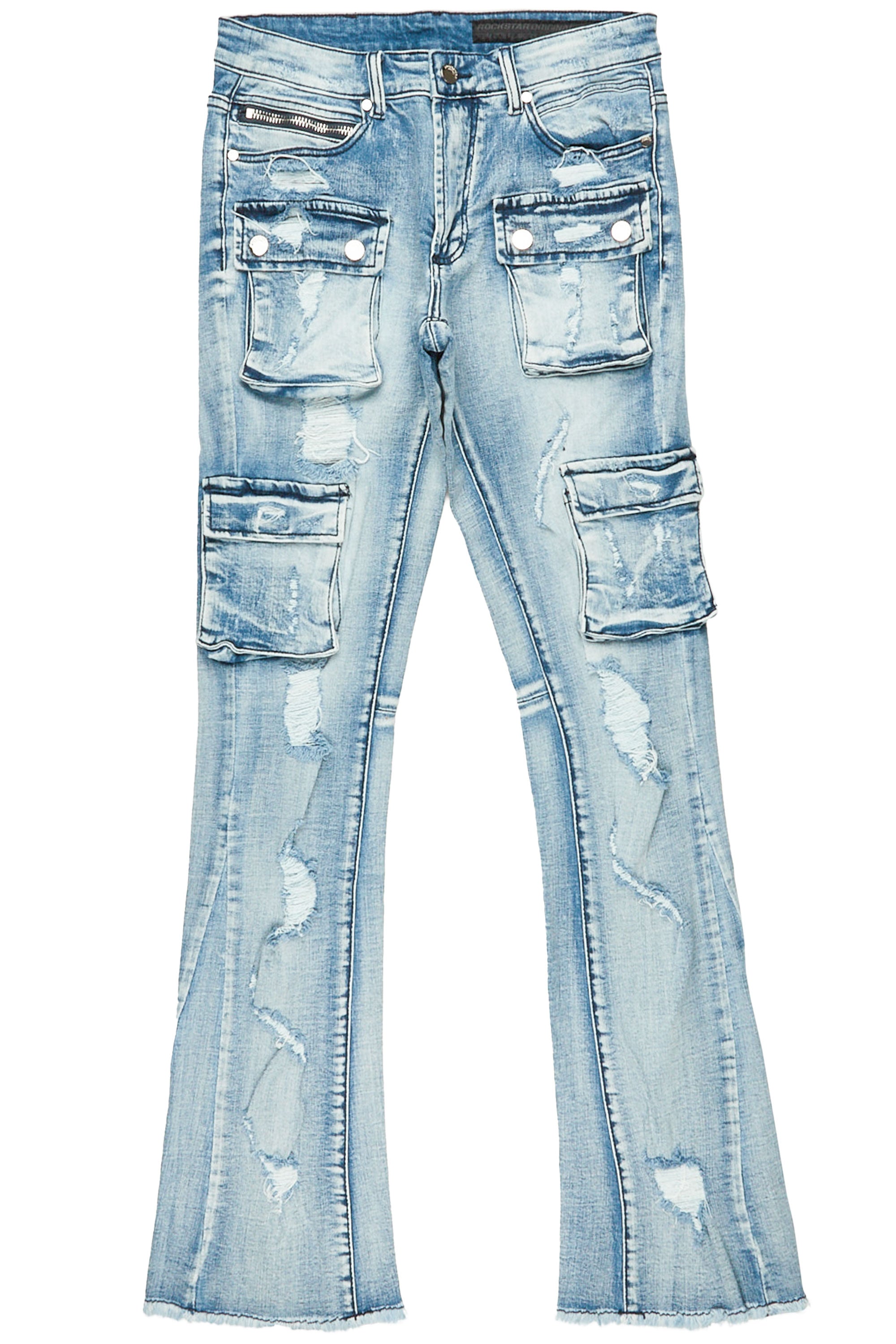 A versatile urban stacked flare jean for men in blue. Designed with organic cotton and custom detailing for an essential denim style.