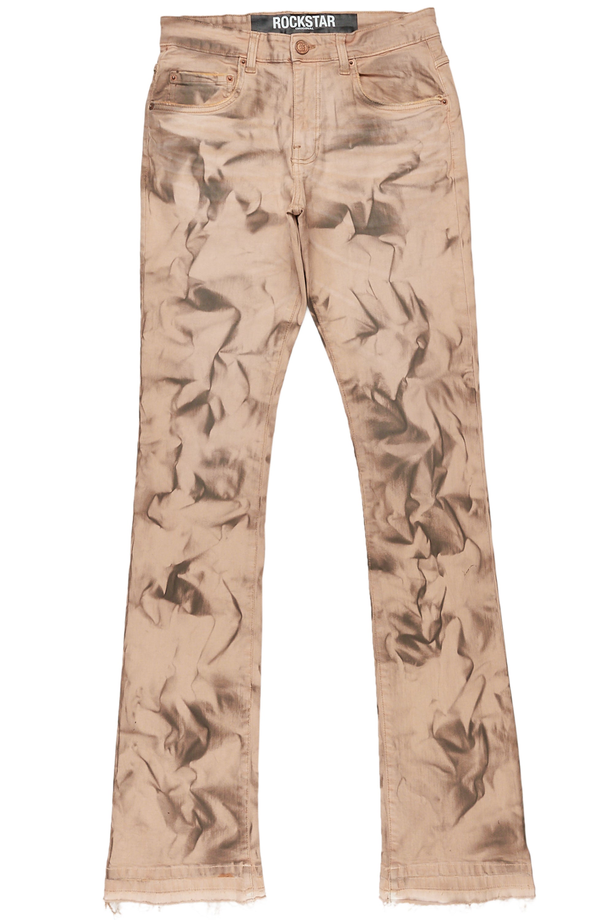 An urban stacked flare jean for men in desert. Designed with organic cotton and distressed details for a dope denim streetwear style.