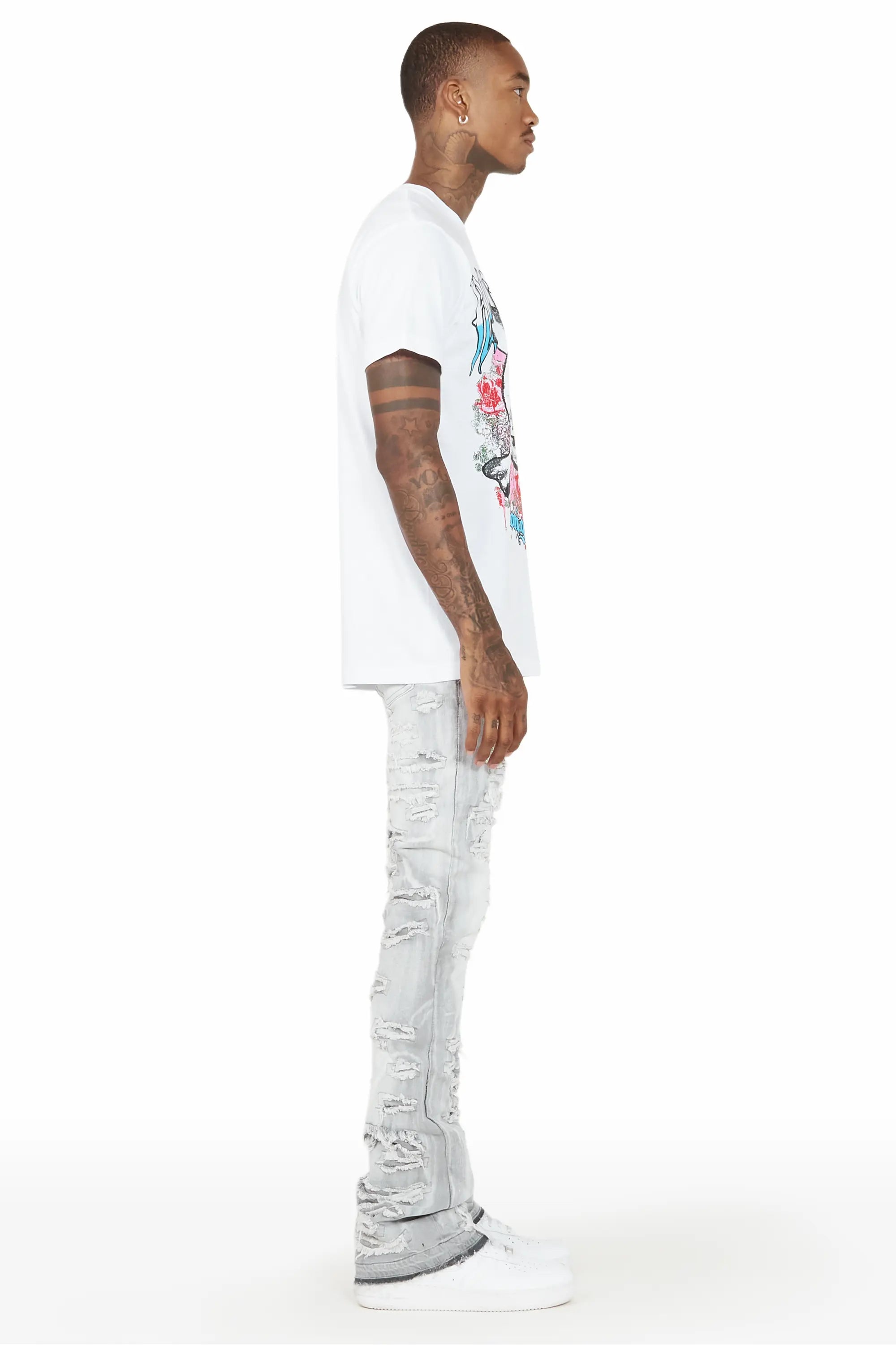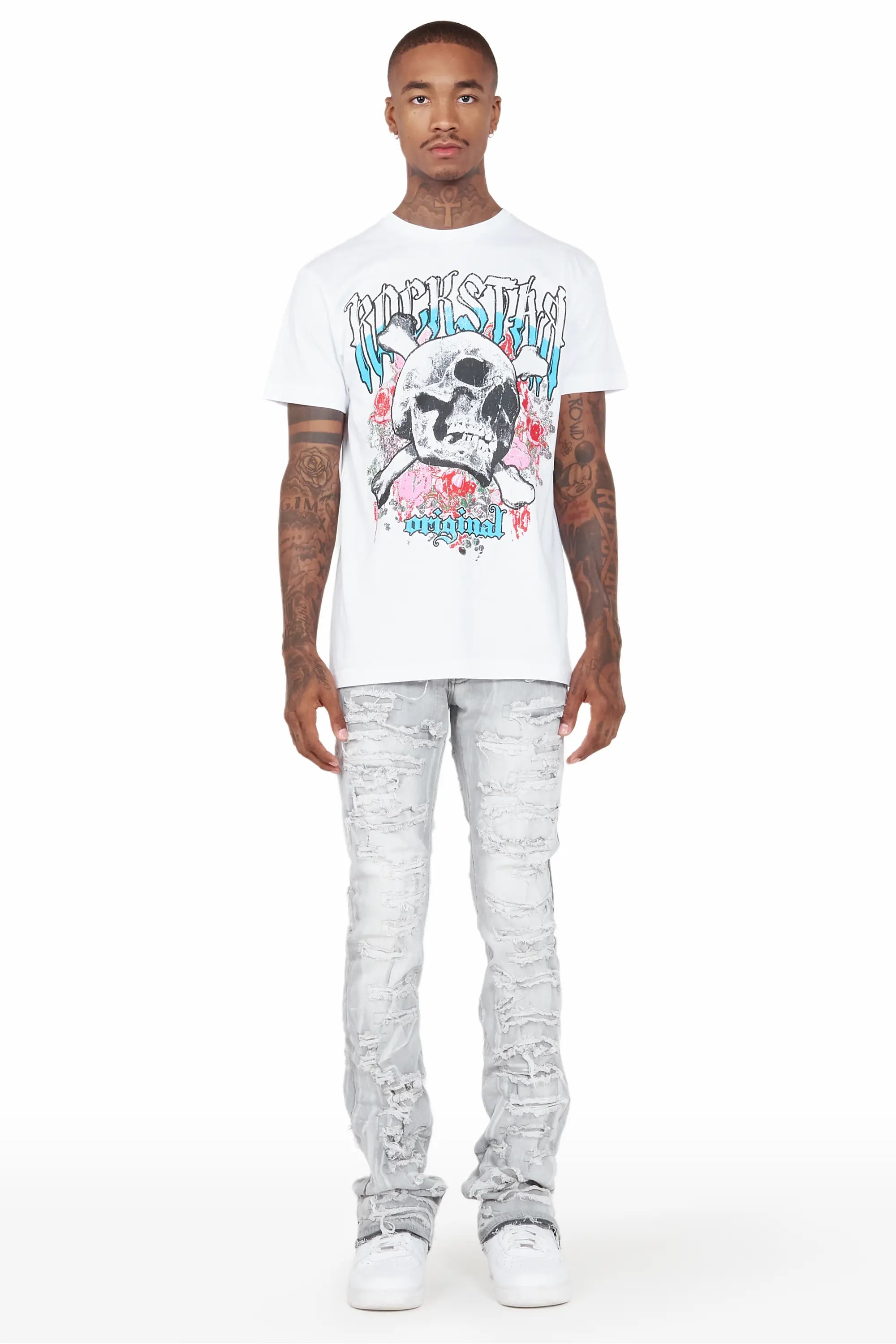 A distressed urban stacked denim jean for men in grey. Designed with organic cotton and frayed rips for a dope streetwear style.