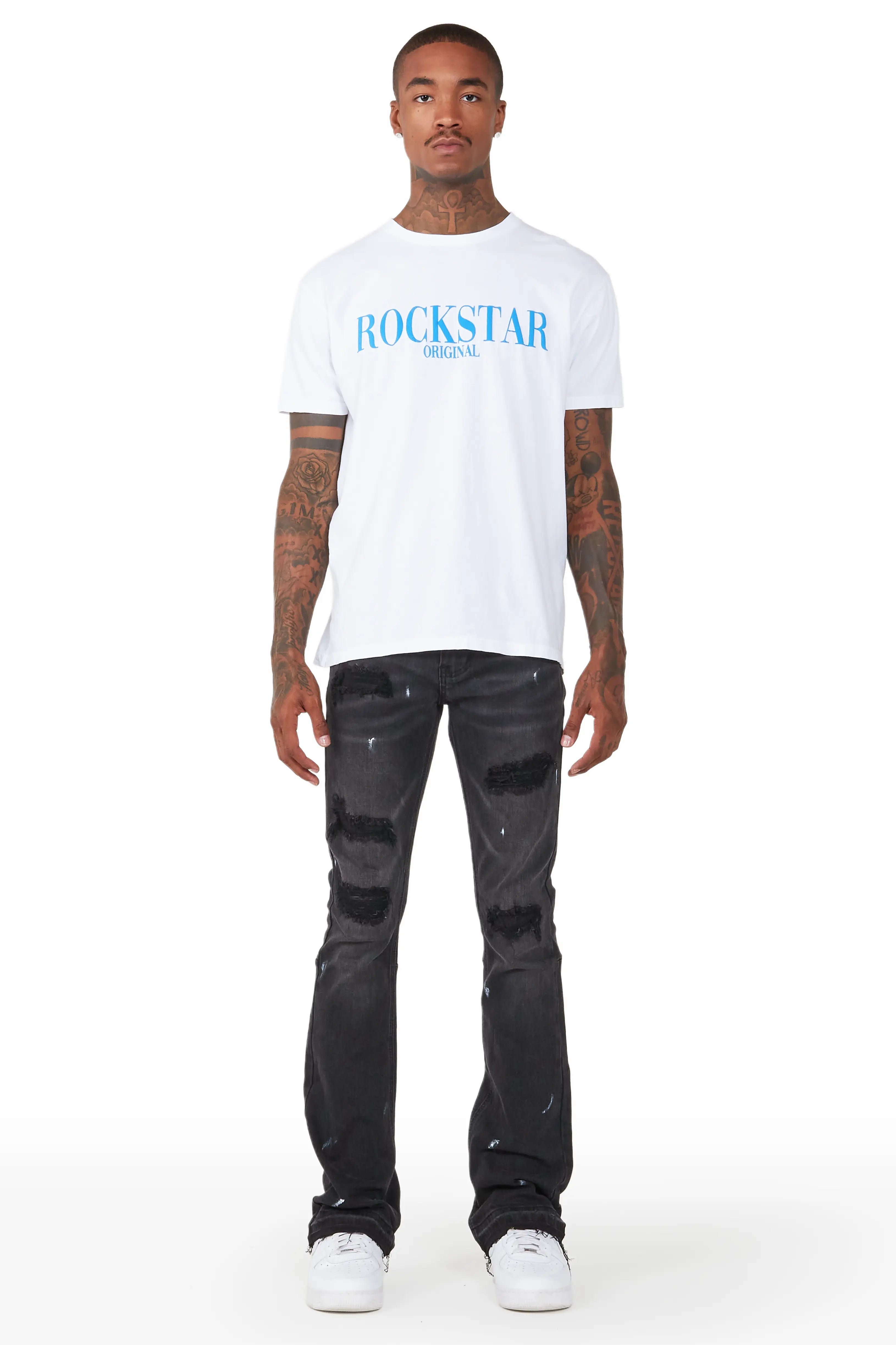 A distressed urban stacked denim jean for men in black. Designed with organic cotton and frayed rips for a dope streetwear style.