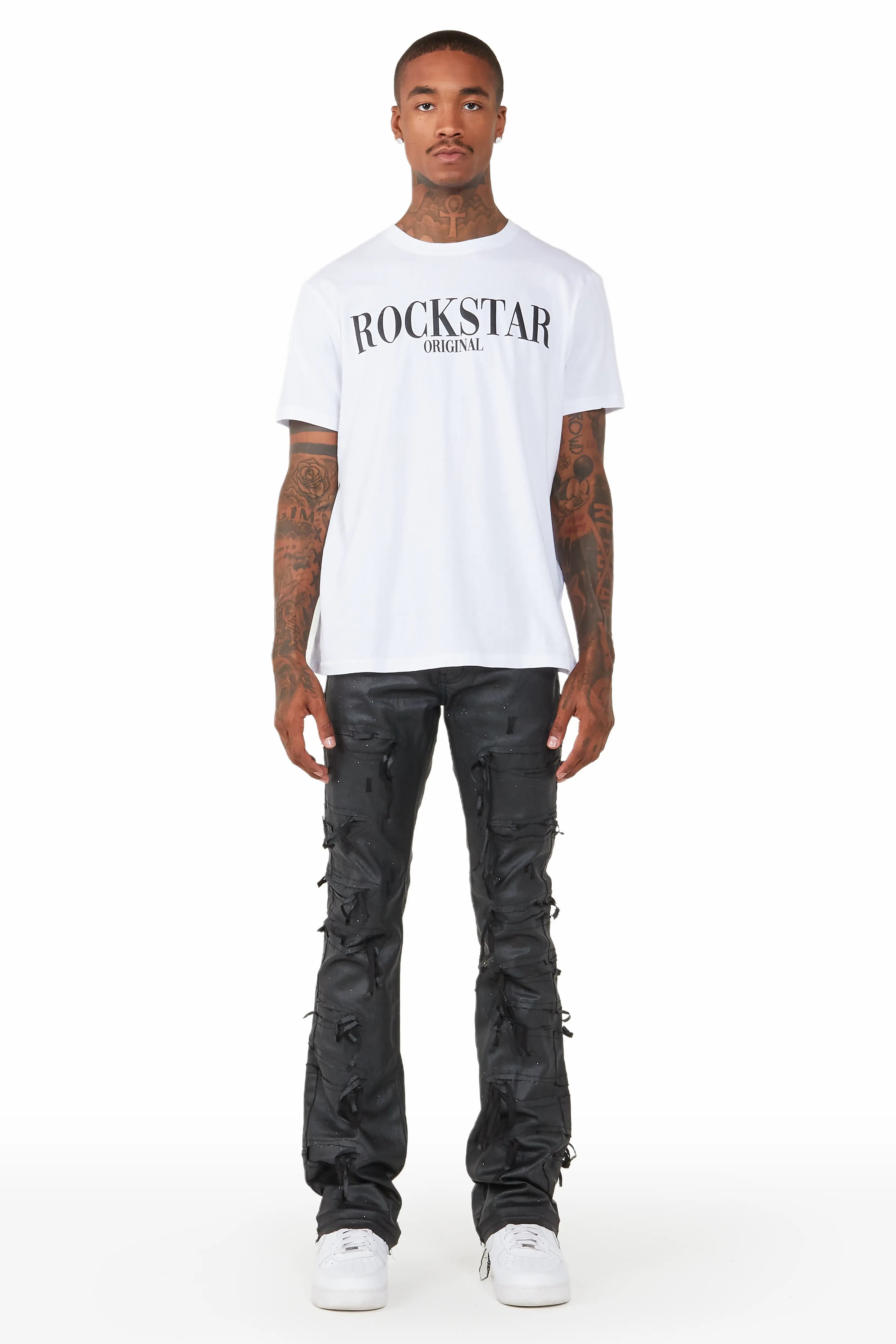 A distressed urban stacked denim jean for men in black. Designed with organic cotton and a waxed coating finish for a dope streetwear style.