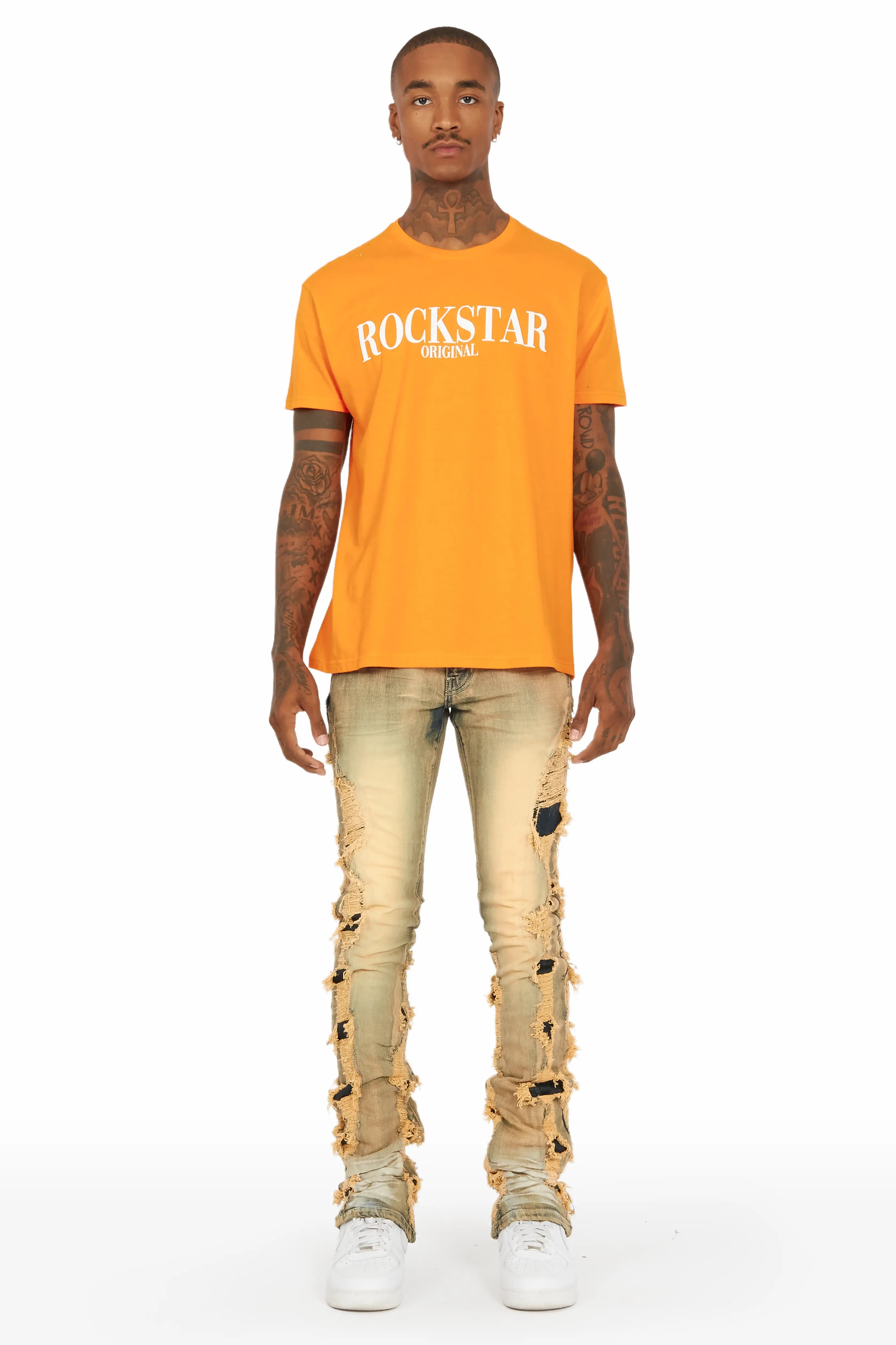 An urban denim jean for men in taupe. Designed with organic cotton and stacked legs for a dope streetwear style.