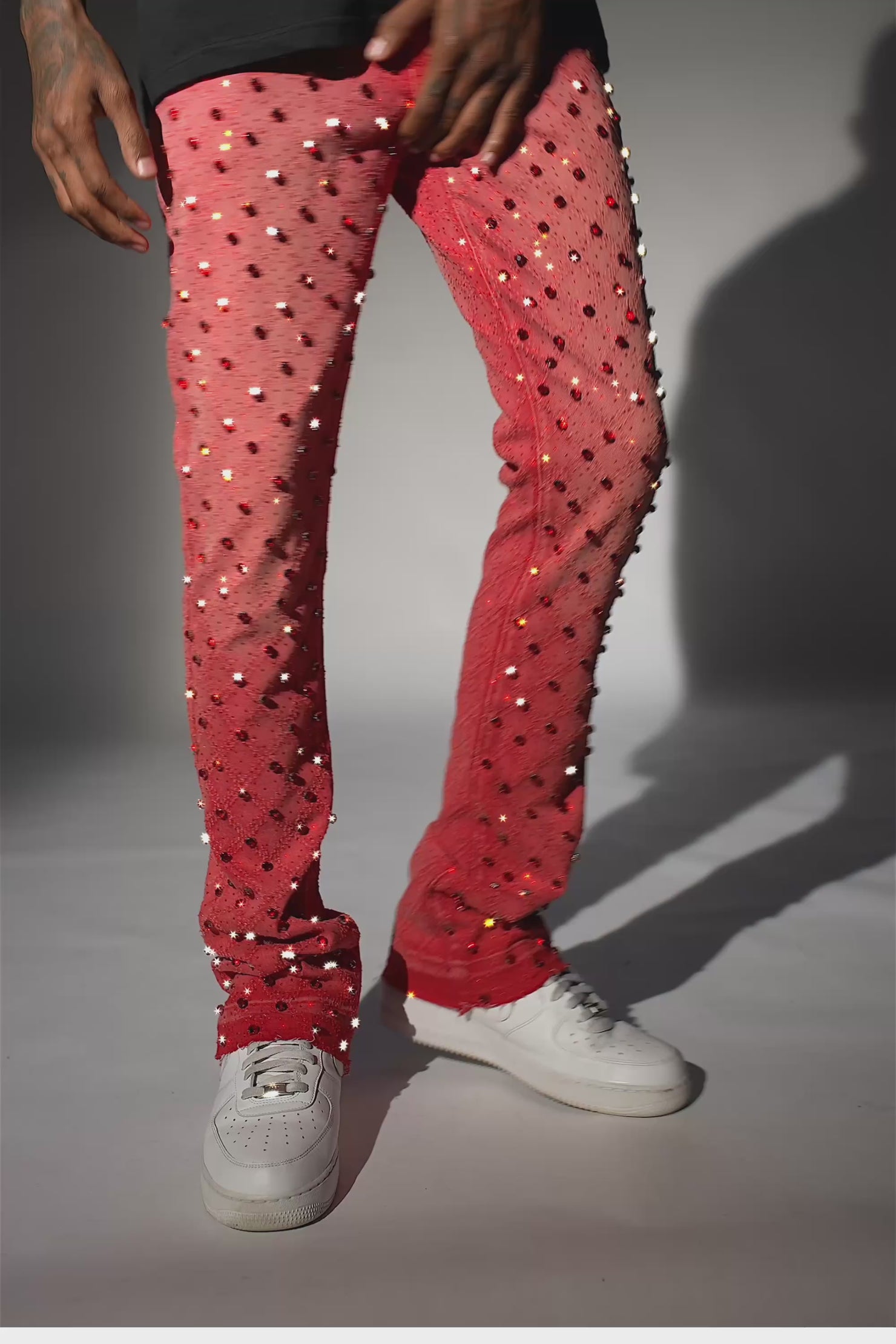 An urban stacked flare denim jean for men in red. Designed with custom rhinestone detailing and extra long legs for a must-cop streetwear staple piece.
