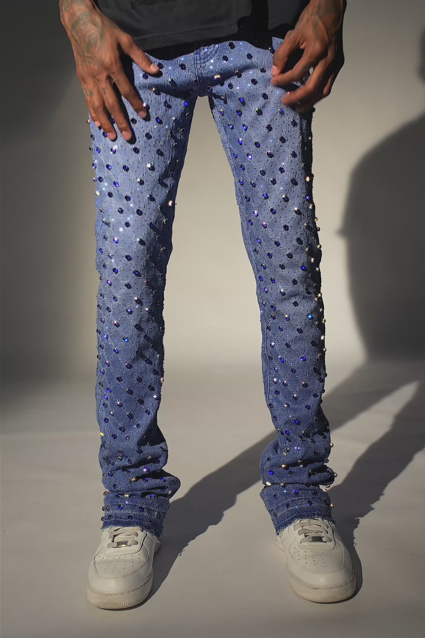 An urban stacked flare denim jean for men in royal blue. Designed with custom rhinestone detailing and extra long legs for a must-cop streetwear staple piece.