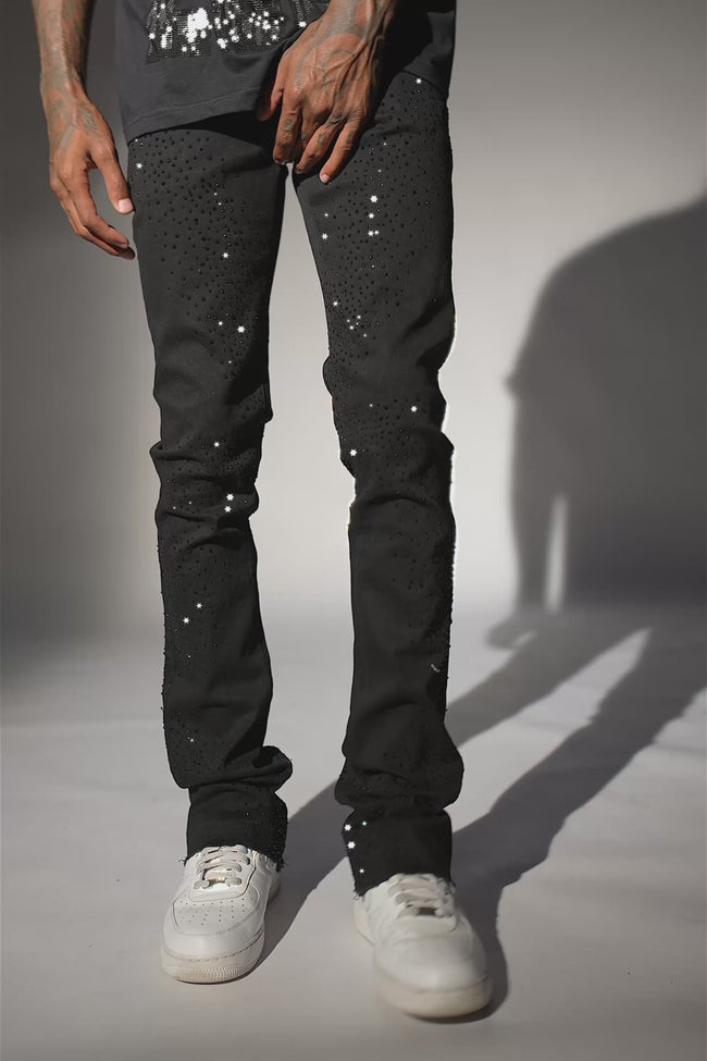 An urban stacked flare denim jean for men in black. Designed with organic cotton and extra long legs for a dope streetwear style.