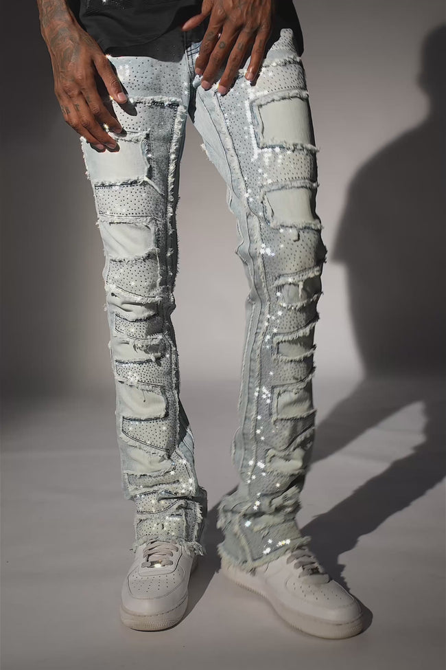 An urban stacked flare denim jean for men in light blue. Designed with custom rhinestone detailing and extra long legs for a must-cop streetwear staple piece.