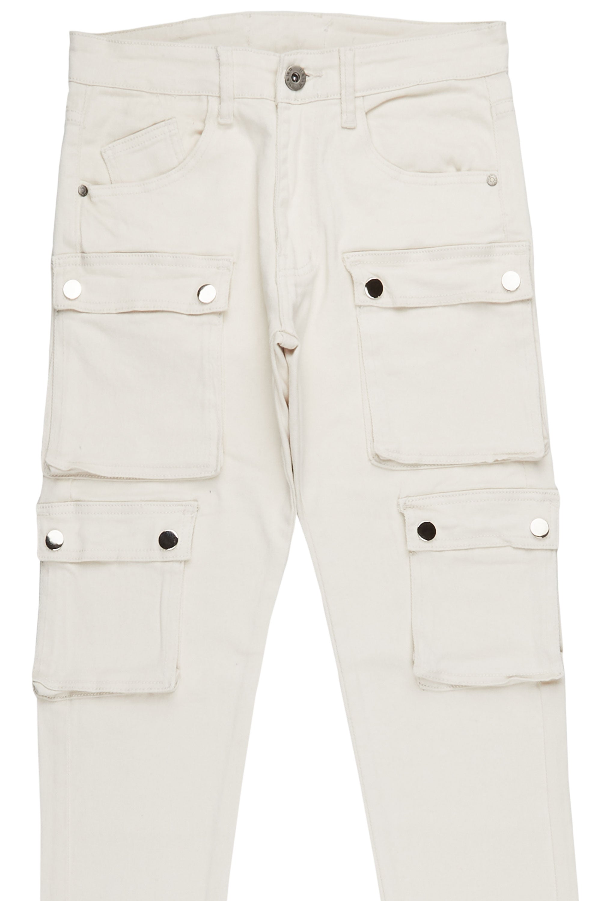 A pair of contemporary cargo jeans for men in white. Designed with organic cotton and utility pockets for the perfect versatile style.