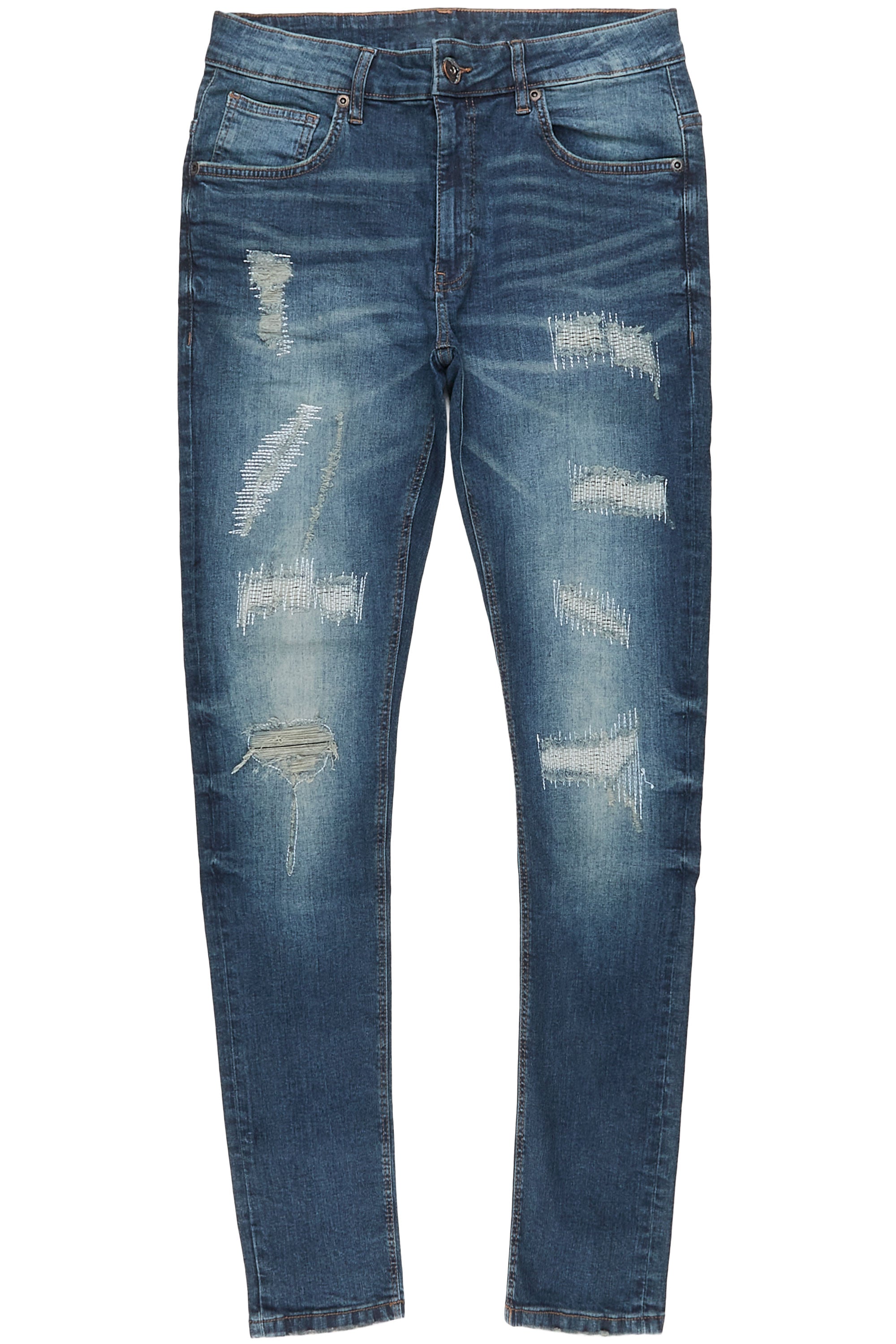 A custom pair of urban streetwear denim jeans for men in dark blue. Designed with organic cotton and deconstructed details for the perfect everyday style.