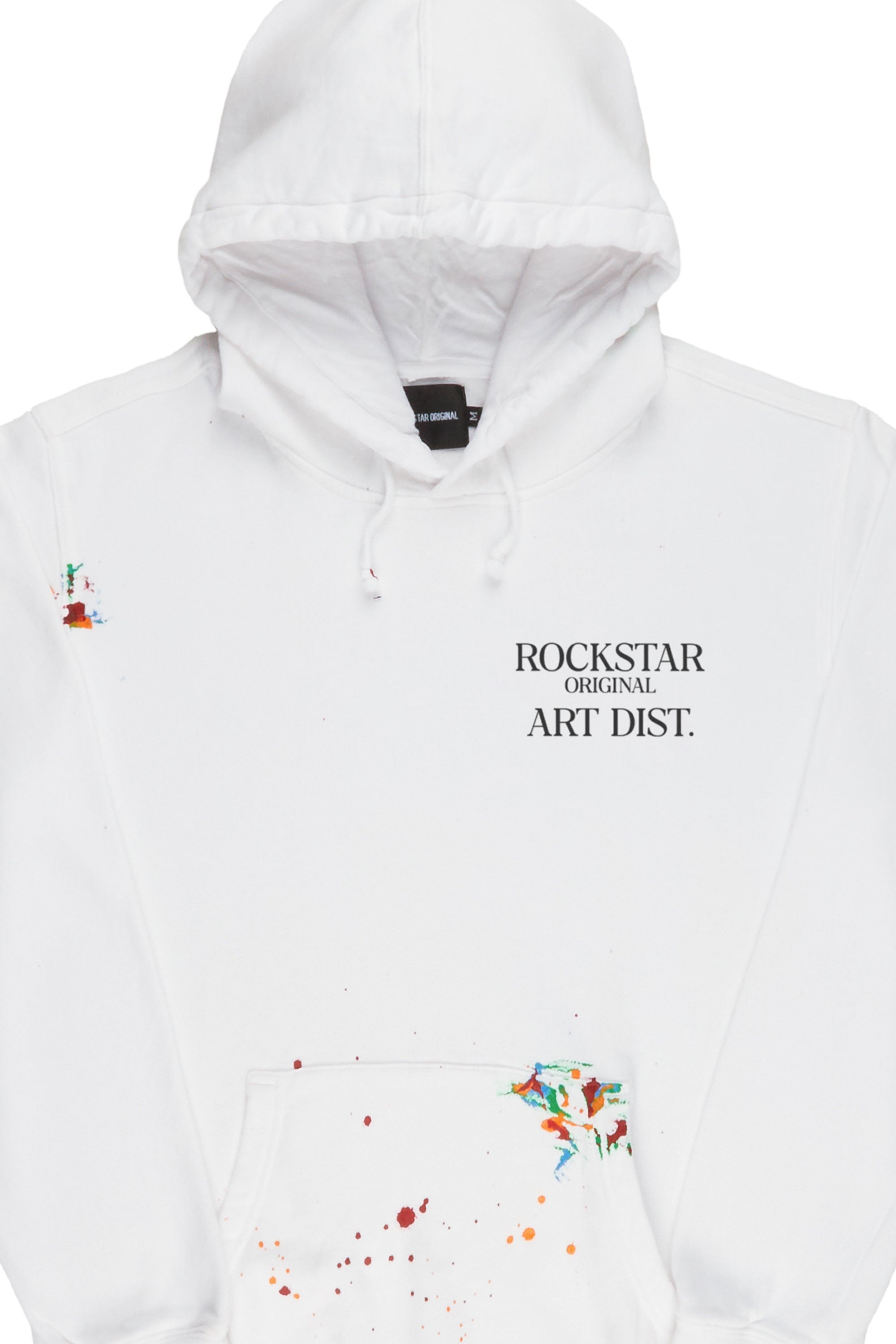 An organic cotton hoodie for men in white. Designed with a worn-in finish and custom splatter paint for the perfect vintage-inspired staple piece.