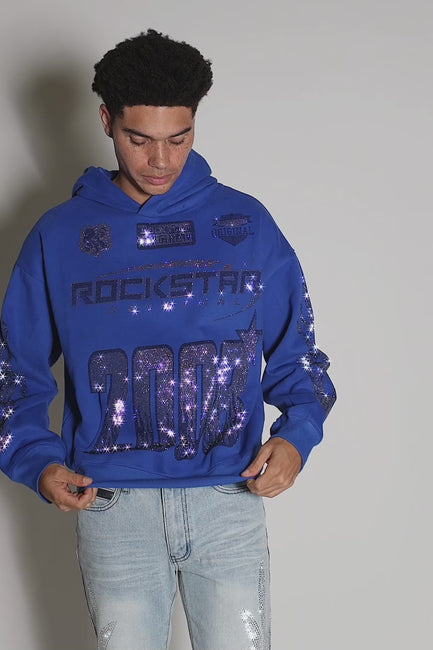 An urban royal blue rhinestone hoodie for men. Designed with organic cotton and custom detailing for a must-cop streetwear tee.