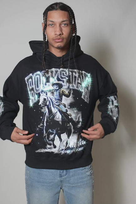 An urban hoodie for men in black. Designed with ultra soft organic cotton and custom rhinestone detailing for a must-cop streetwear style.