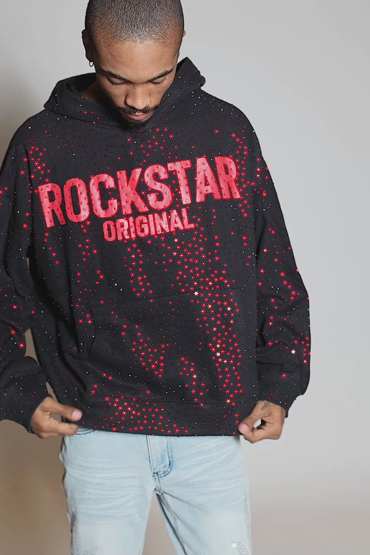 An urban hoodie for men in black. Designed with ultra soft organic cotton and custom rhinestone detailing for a must-cop streetwear style.