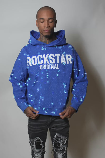 An urban hoodie for men in royal blue. Designed with ultra soft organic cotton and custom rhinestone detailing for a must-cop streetwear style.