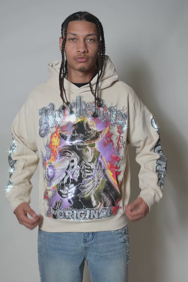 An urban hoodie for men in beige. Designed with ultra soft organic cotton and custom rhinestone detailing for a must-cop streetwear style.