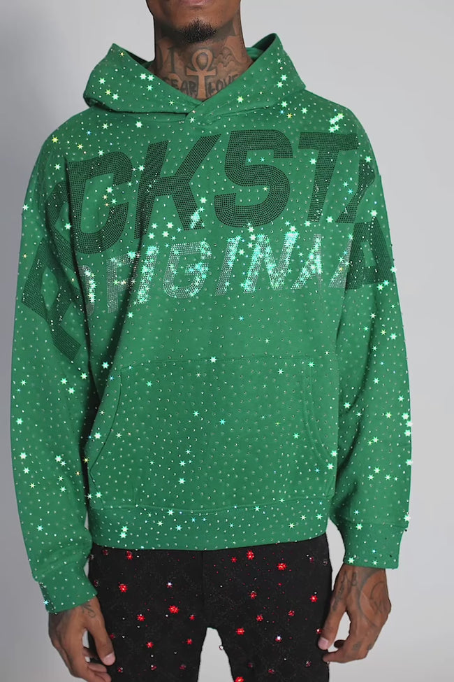 An urban hoodie for men in green. Designed with ultra soft organic cotton and custom rhinestone detailing for a must-cop streetwear style.