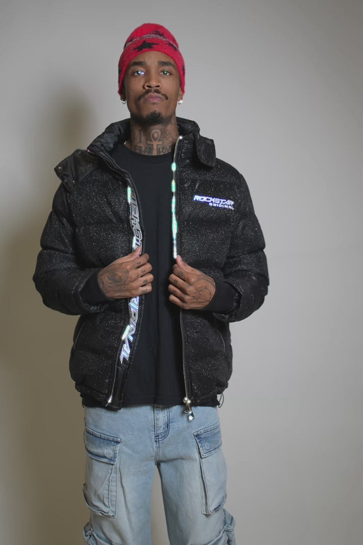 An urban black quilted puffer jacket for men. Designed with custom glitter fabric for a perfect streetwear statement piece.