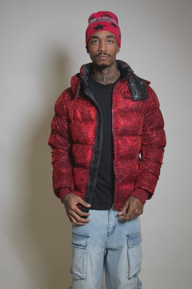 An urban red quilted puffer jacket for men. Designed with custom glitter fabric for a perfect streetwear statement piece.