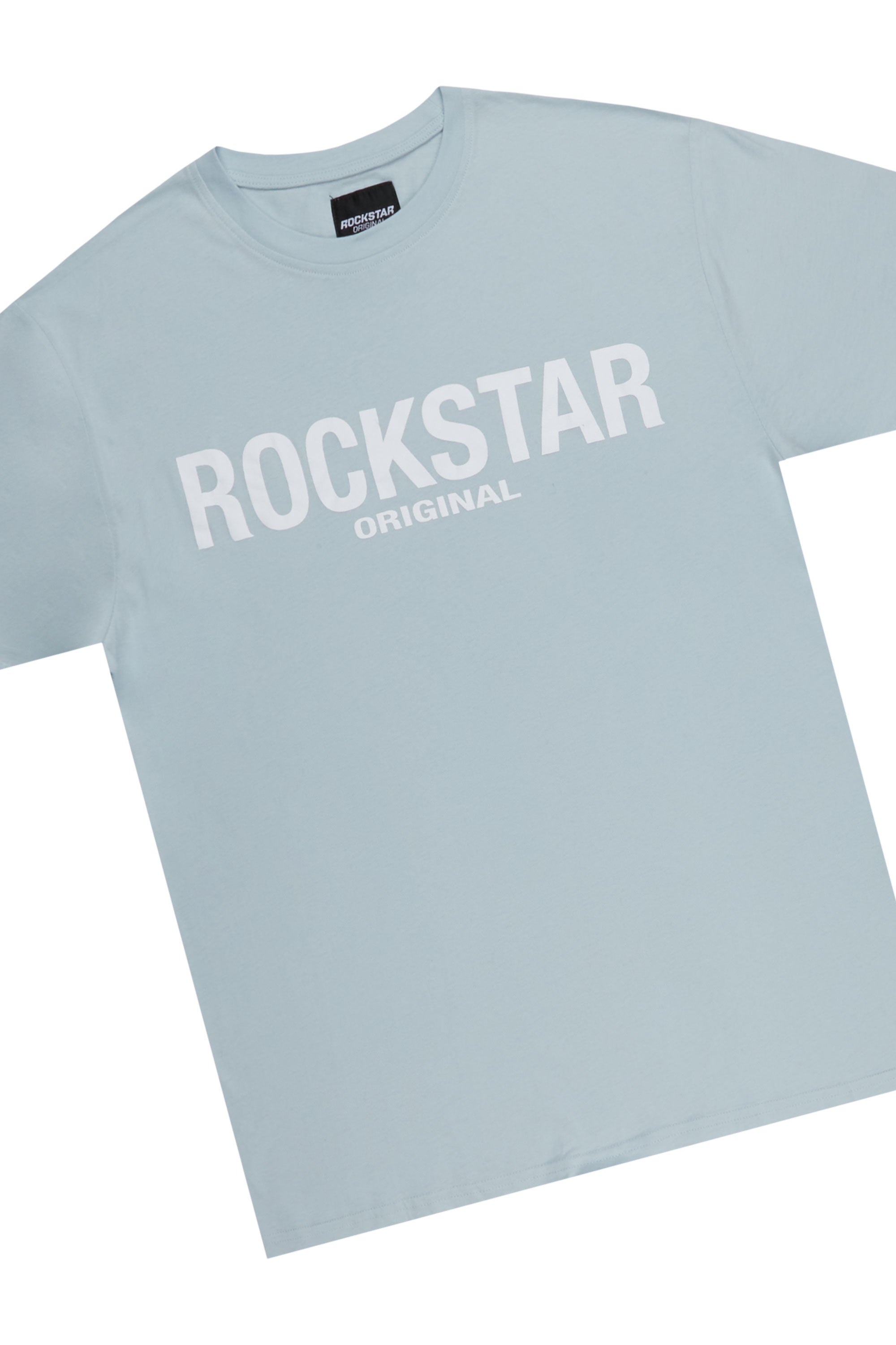An urban two-piece athleisure tee and short set for men in baby blue. Designed with organic cotton and custom detailing for a lightweight everyday set.