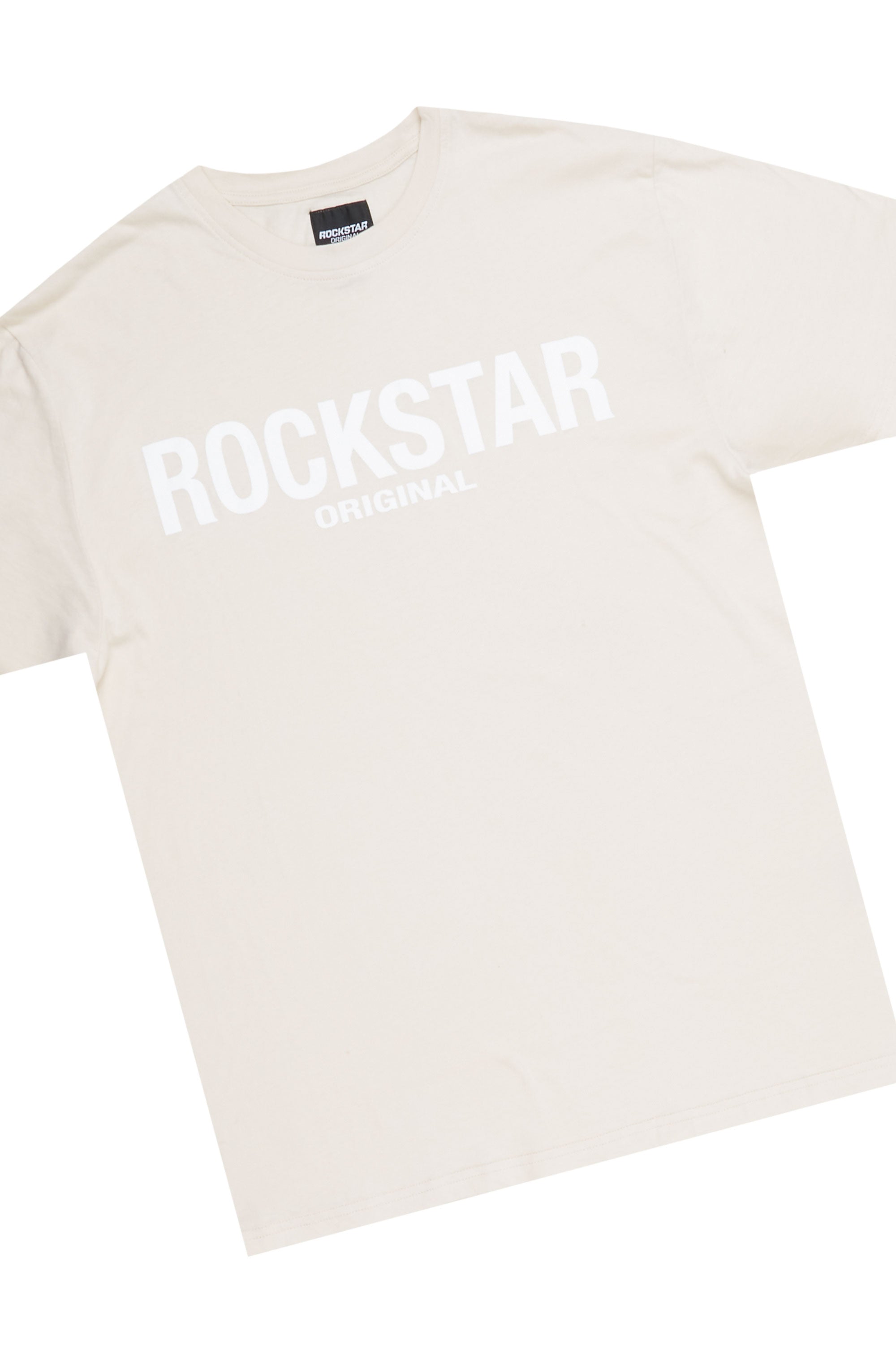 An urban two-piece athleisure tee and short set for men in beige. Designed with organic cotton and custom detailing for a lightweight everyday set.