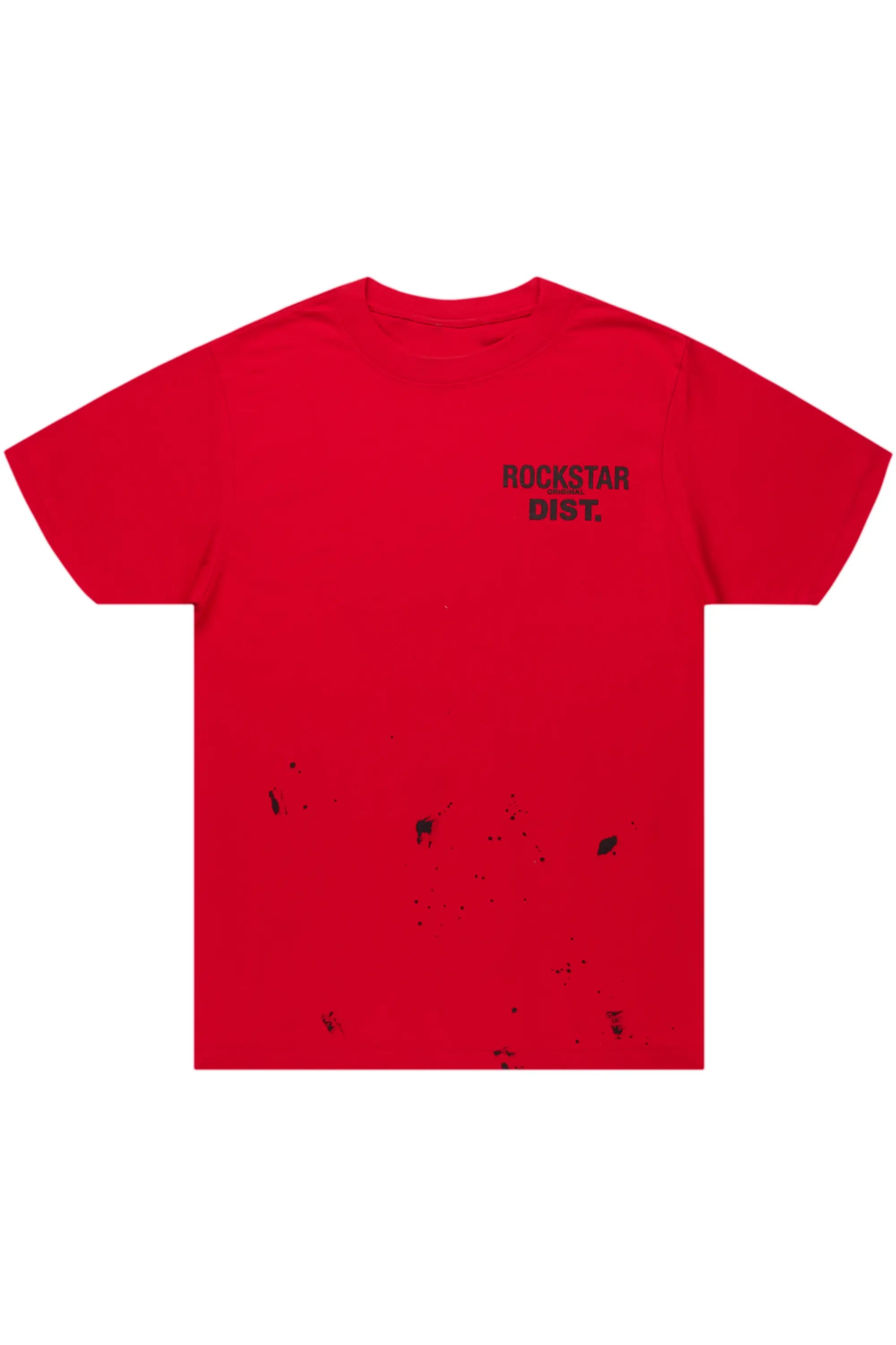 An urban streetwear t-shirt for men in red. Designed with organic cotton and a custom paint spatter detailing for the perfect staple piece style.