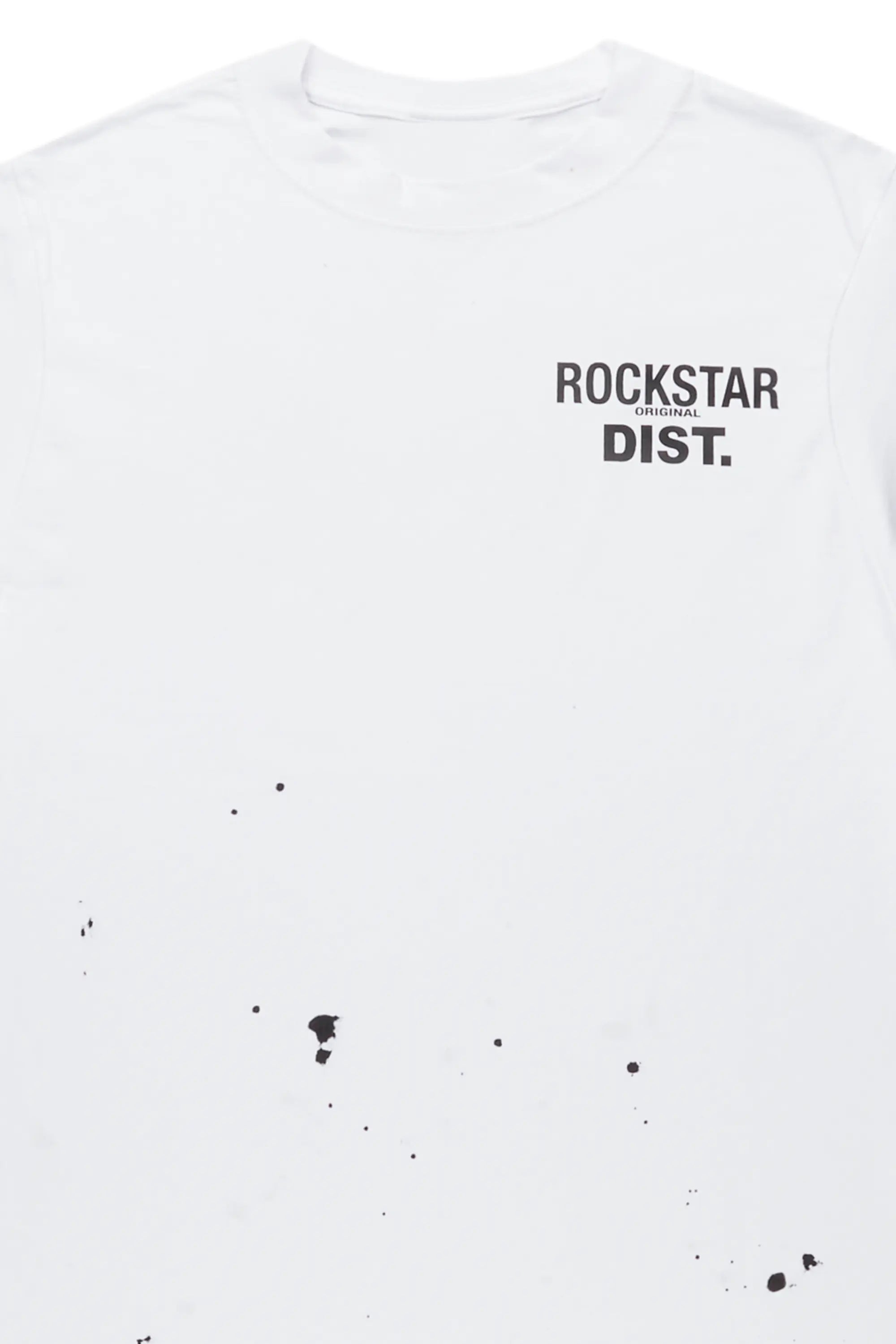An urban streetwear t-shirt for men in white. Designed with organic cotton and a custom paint spatter detailing for the perfect staple piece style.