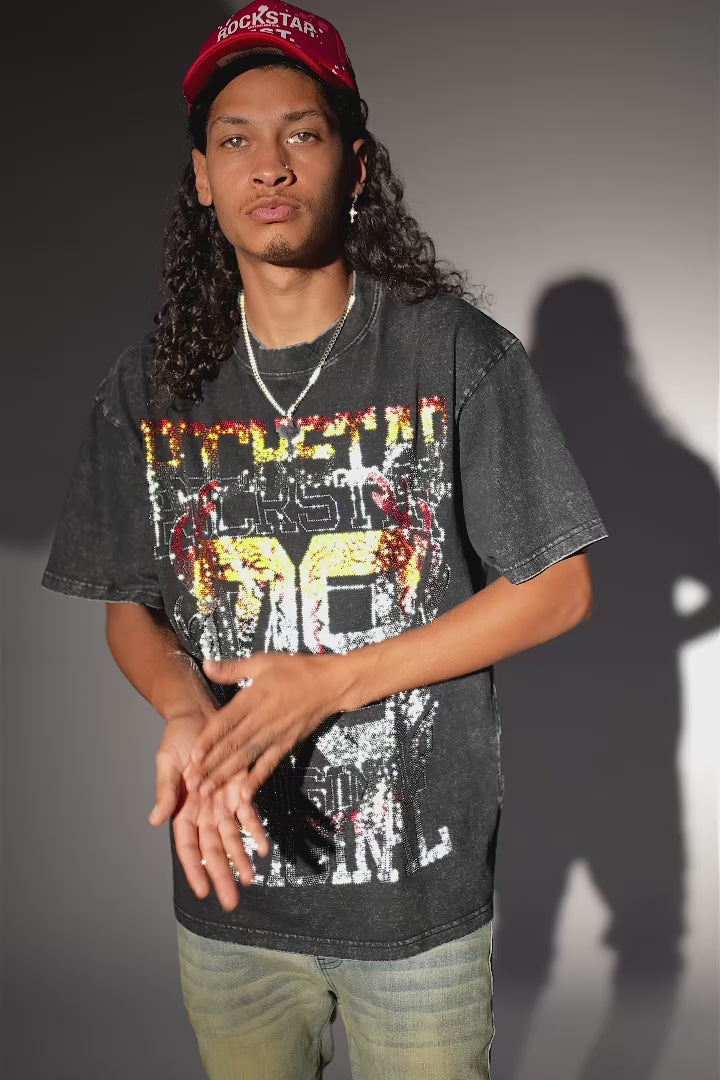 An urban graphic tee for men in black. Designed with organic cotton and custom studded rhinestone detailing for a must-have streetwear style.