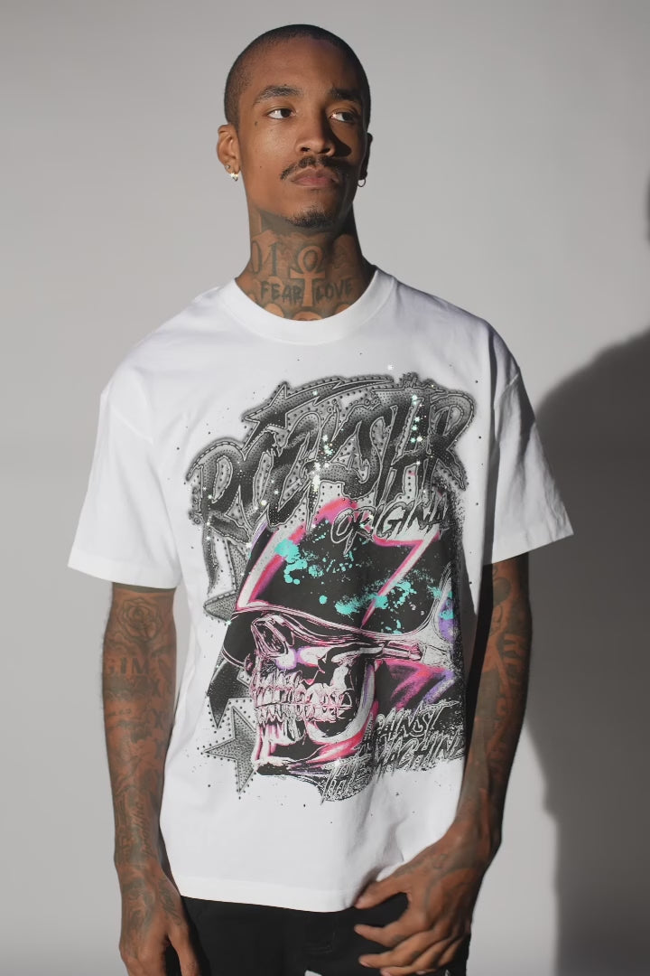 An urban streetwear t-shirt for men in white. Designed with organic cotton and custom detailing for a must-cop staple tee.