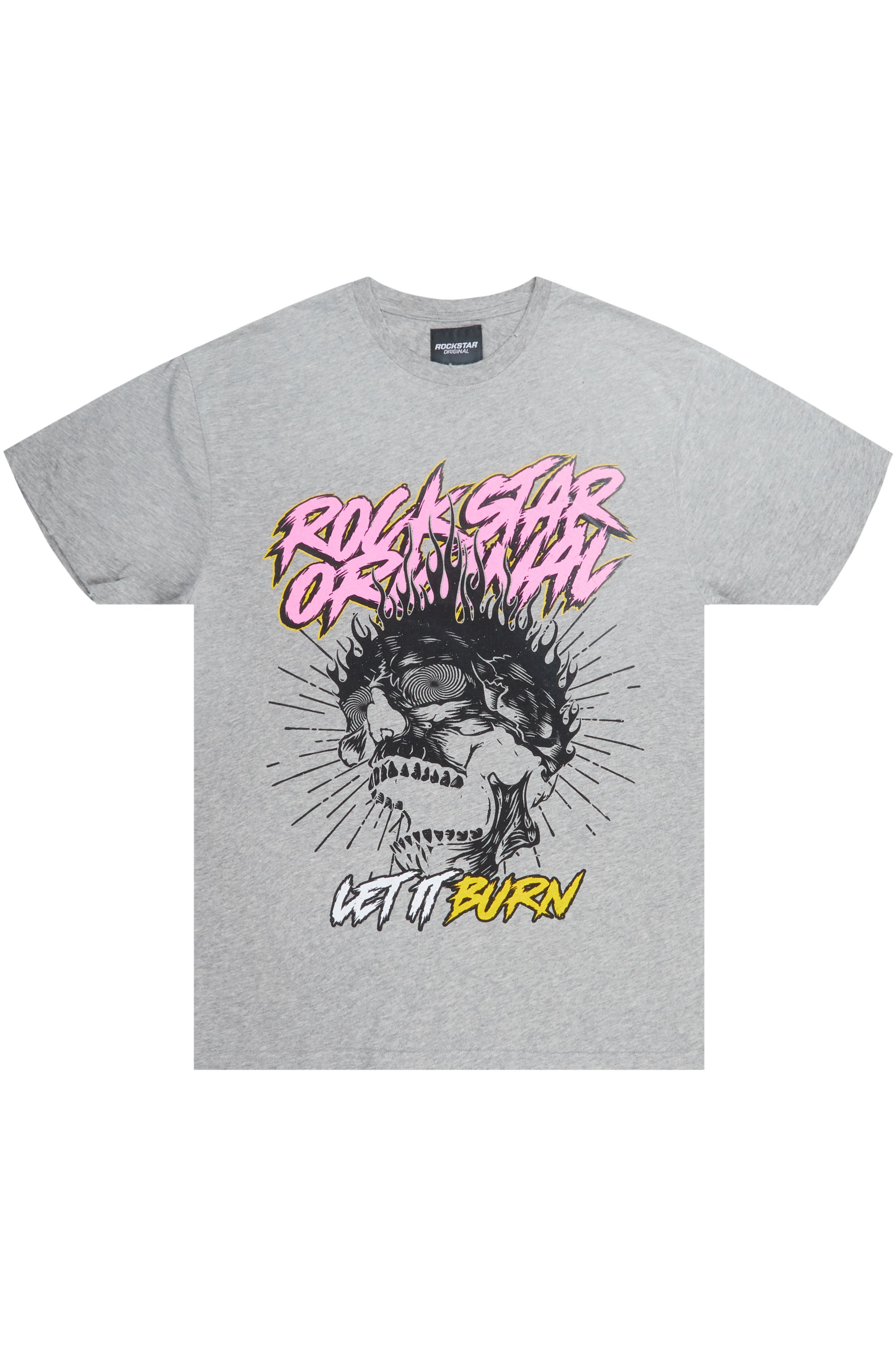 An urban streetwear t-shirt for men in grey. Designed with organic cotton and a custom multi-color graphic for the perfect staple piece style.