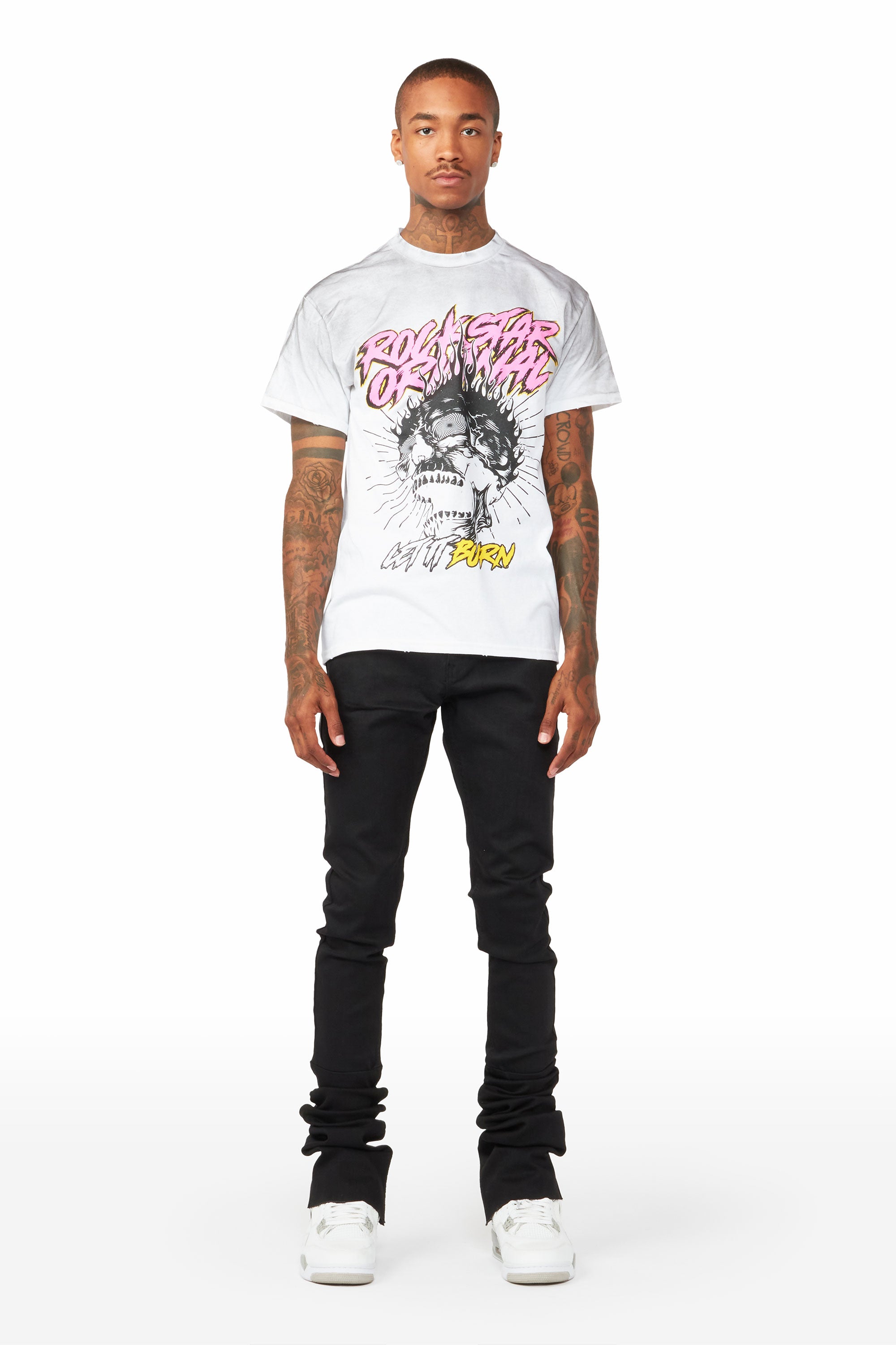 An urban streetwear t-shirt for men in white. Designed with organic cotton and a custom multi-color graphic for the perfect staple piece style.