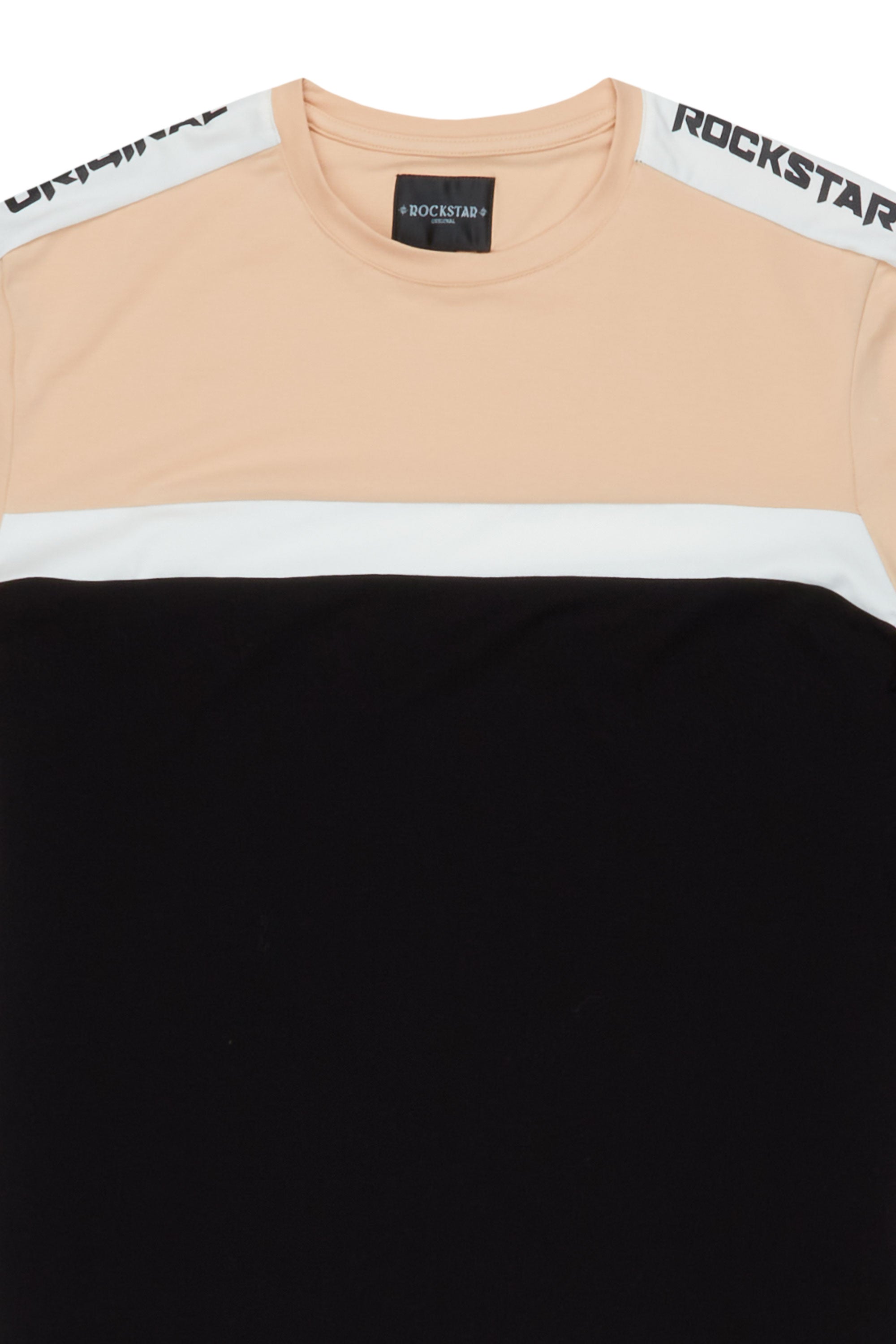 A neutral-tone urban streetwear t-shirt for men in beige and black. Designed with lightweight fabric for a versatile style.