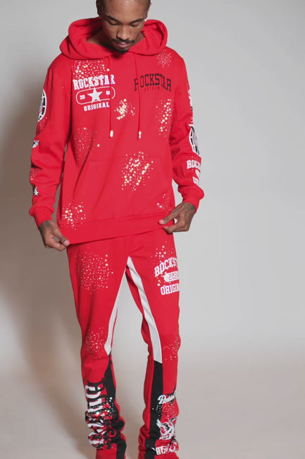 An urban two-piece hoodie and stack track pant set for men in red. Designed with extra long legs and custom detailing for a must-cop streetwear essential.