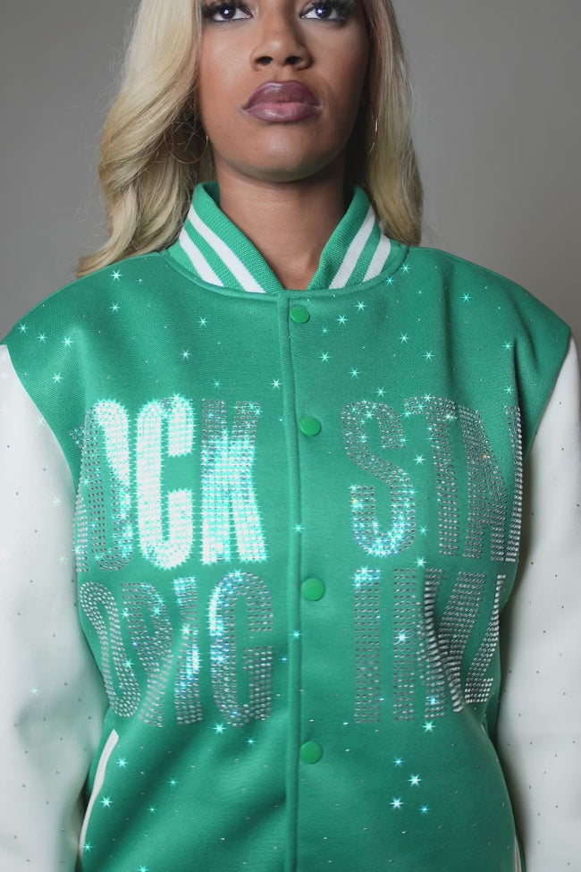 nakiah green rhinestone varsity jacket