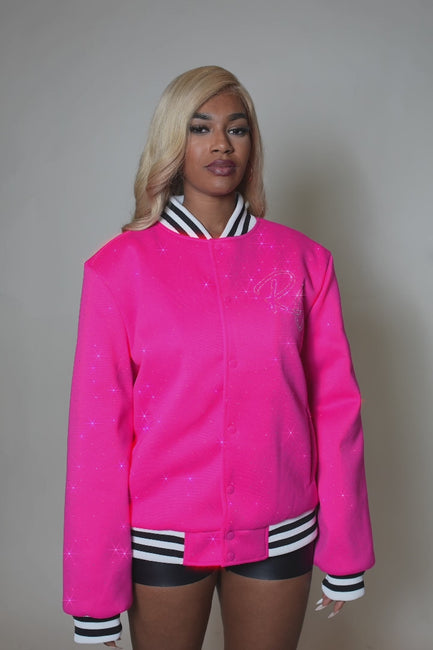 alonza hot pink rhinestone varsity jacket
