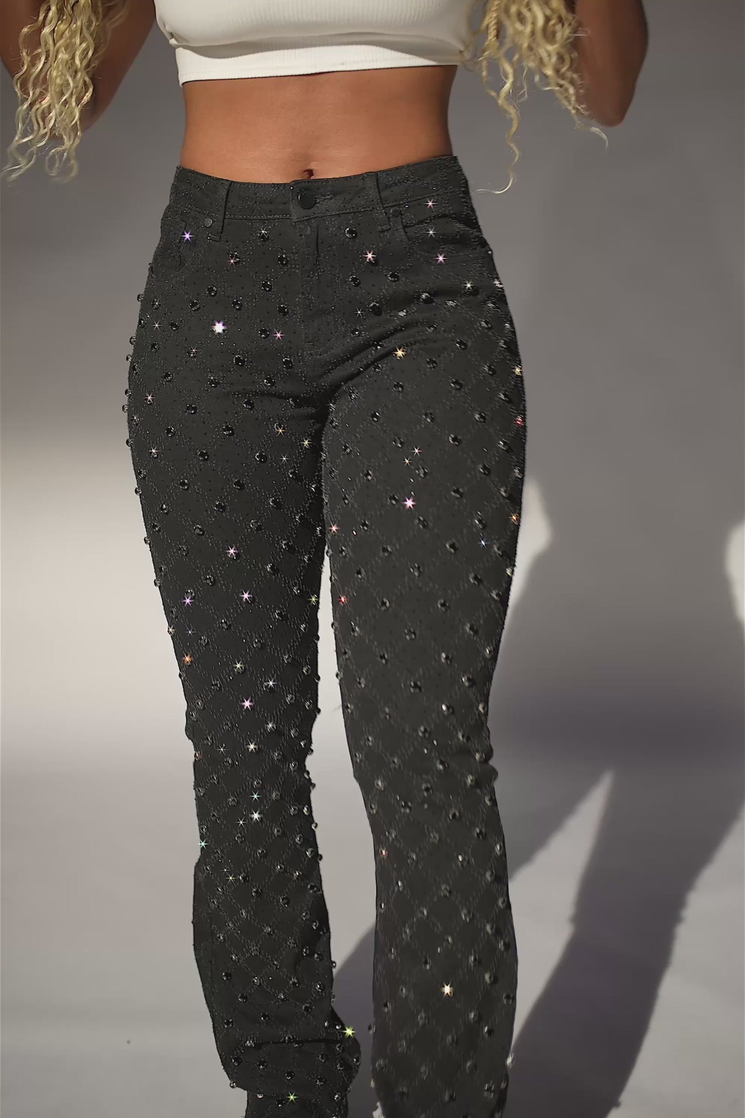 An urban stacked flare denim jean for women in black. Designed with custom rhinestone detailing and extra long legs for a must-cop streetwear staple piece.