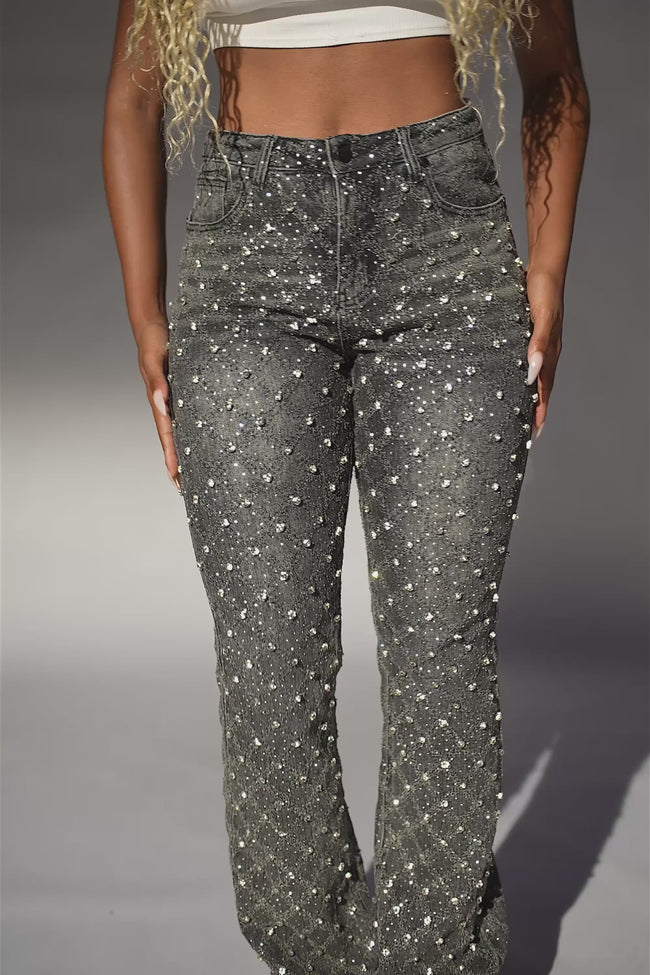An urban stacked flare denim jean for women in grey wash. Designed with custom rhinestone detailing and extra long legs for a must-cop streetwear staple piece.
