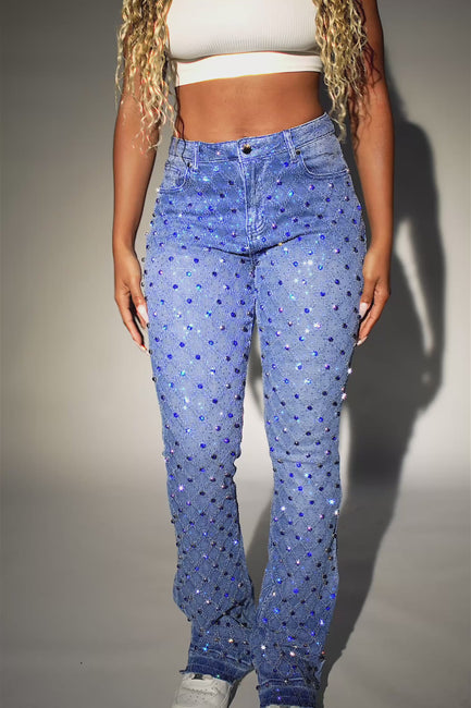 An urban stacked flare denim jean for women in royal blue. Designed with custom rhinestone detailing and extra long legs for a must-cop streetwear staple piece.
