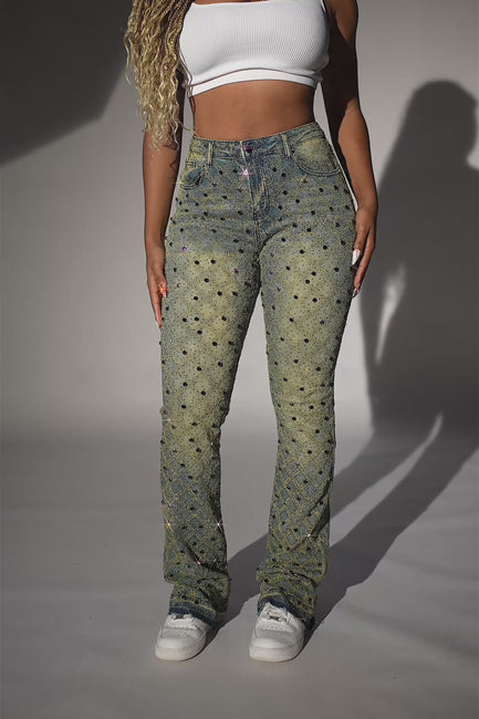 An urban stacked flare denim jean for women in tinted dark wash. Designed with custom rhinestone detailing and extra long legs for a must-cop streetwear staple piece.
