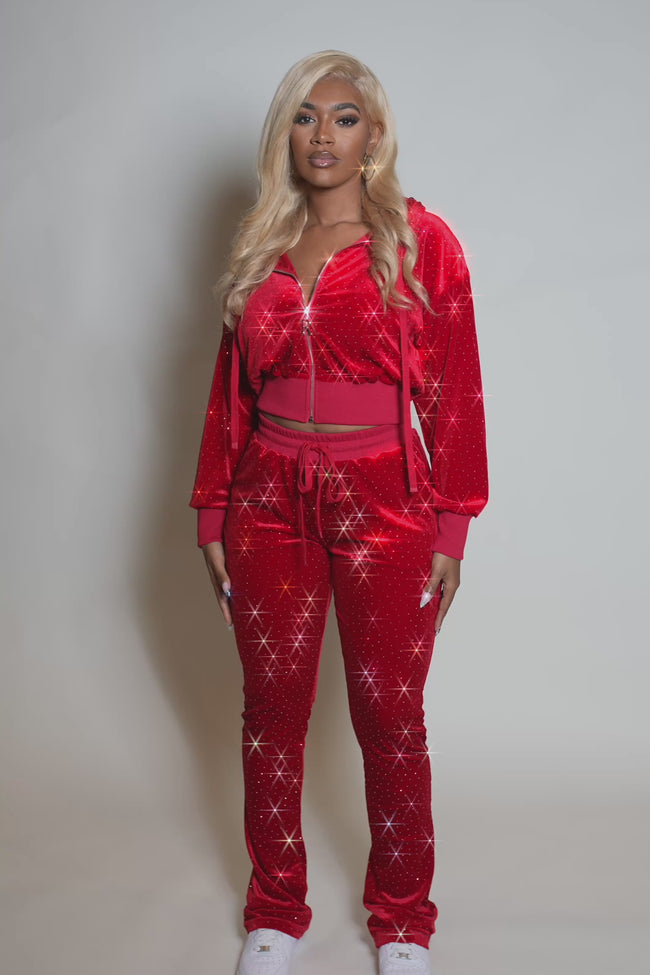 A trendy two-piece hoodie and stacked pant velour tracksuit set for women in red. Designed with ultra soft fabric and custom detailing for the perfect streetwear set.