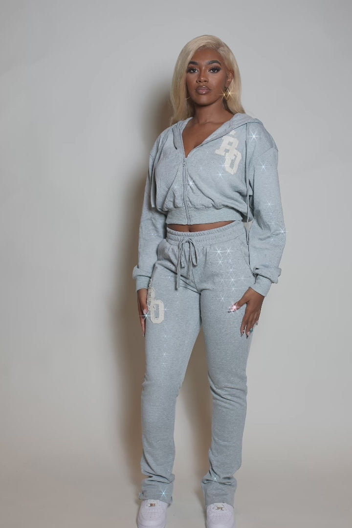A trendy two-piece zip-up crop jacket and stacked track pant set for women in heather grey. Designed with ultra soft organic cotton and custom rhinestone detailing for the perfect everyday set.