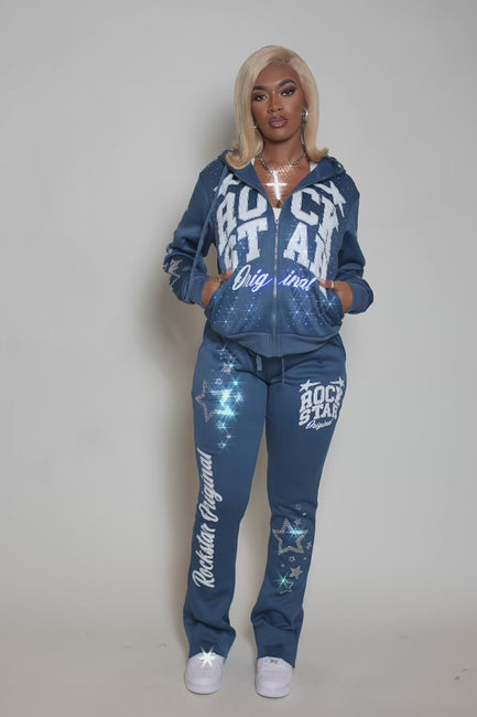 An urban two-piece hoodie and stack track pant set for women in navy. Designed with extra long legs and custom detailing for a gorgeous streetwear essential.